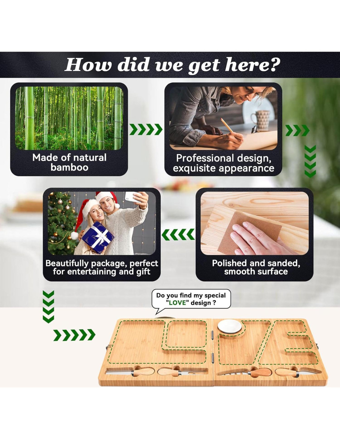 - Fácil de Limpiar y Mantener: Mantén la apariencia elegante y pulida de tu tabla de charcutería de bambú con un mínimo esfuerzo. Simplemente límpiala con un paño húmedo después de usar. Es resistente a manchas y olores, lo que la convierte en una adición duradera y de bajo mantenimiento a tu cocina o espacio de entretenimiento.