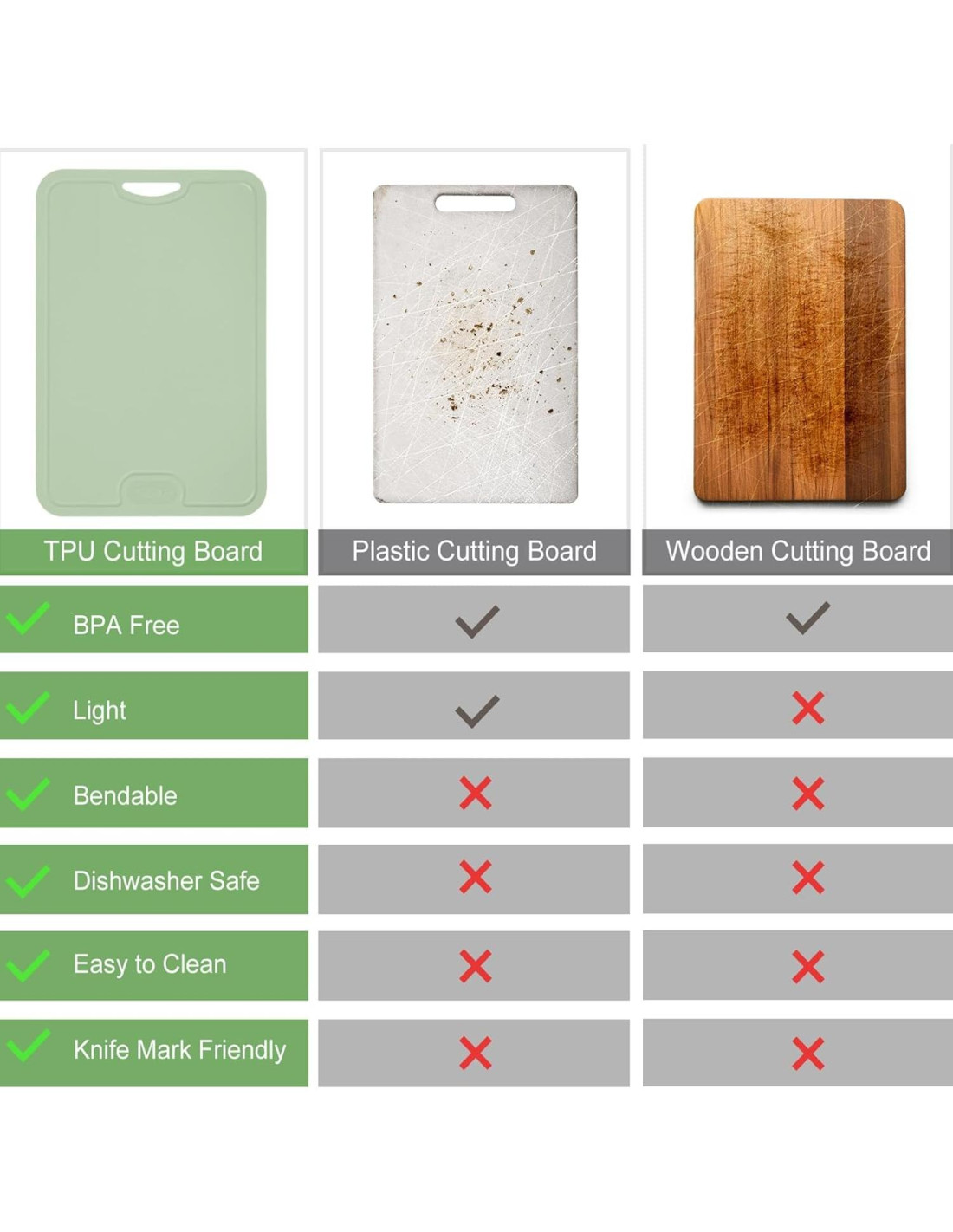 - Resistente a Rayones: El material de las tablas de cortar flexibles es TPU, que tiene ventajas destacadas: es amigable con las marcas de cuchillo, flexible y tiene un peso ligero. Las tablas de cortar están diseñadas para proteger el cuchillo: el cuchillo se mantendrá afilado y, además, la tabla de cortar de TPU también se mantendrá nueva.