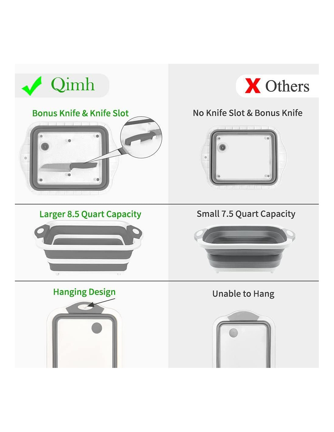 La Tabla de Cortar Plegable Qimh debe ser una necesidad para tus actividades al aire libre y el trabajo en la cocina de casa. Superará tus expectativas. Calidad y comodidad se encuentran aquí para crear el colador, tabla de cortar y canasta perfectos... Adecuado para todo tipo de necesidades, desde frutas frescas hasta verduras verdes. El diseño portátil puede plegarse en una forma compacta, menos de 5 centímetros de alto para un almacenamiento conveniente y ahorro de espacio. El tazón plegable es liviano, ocupa muy poco espacio y es fácil de empacar y transportar. Perfecto para limpiar y remojar verduras y frutas antes de cocinar. La tina de lavado plegable viene con su propio tapón, lo que significa que no tendrás que inclinarte para drenar.