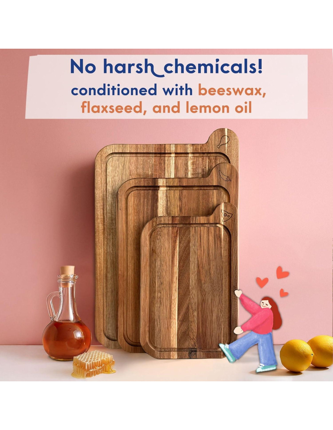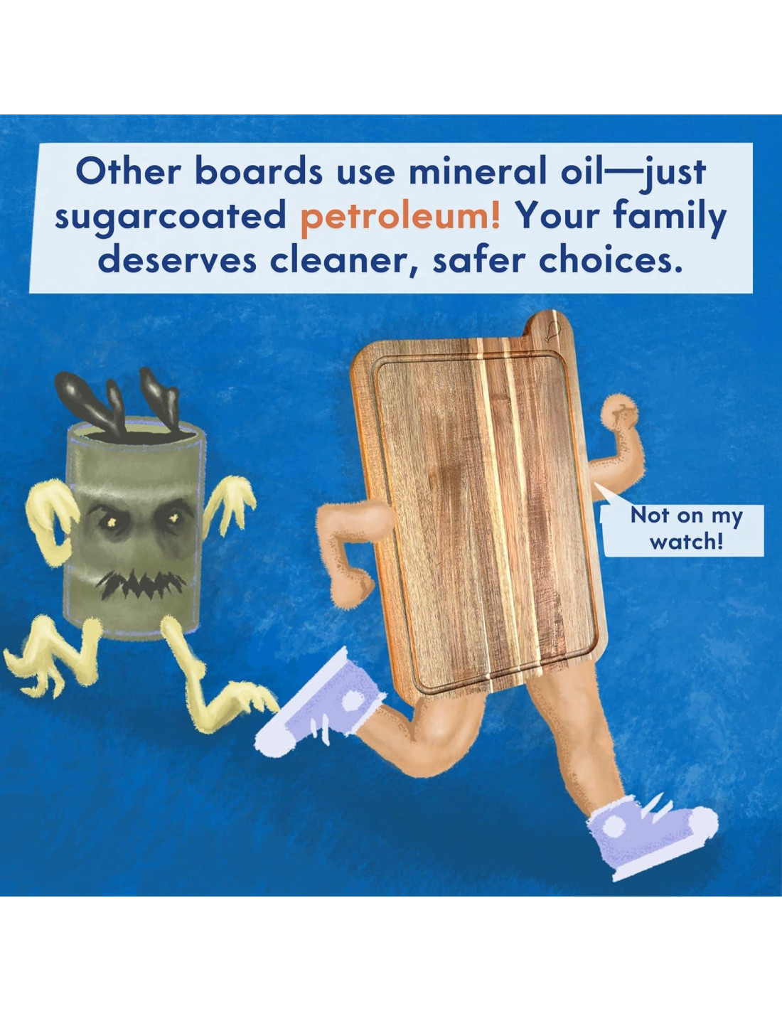 - 1 - 7 veces más duradera. La mayoría de las tablas de cortar están acondicionadas con aceite mineral, un subproducto del petróleo que no pertenece cerca de tu comida. Las nuestras están terminadas con una mezcla limpia de cera de abeja sin blanquear, aceite de linaza y aceite de limón. Sin aceite mineral, sin BPA, sin ftalatos. Solo ingredientes naturales y seguros para alimentos que protegen la madera y te dan tranquilidad con cada corte.
