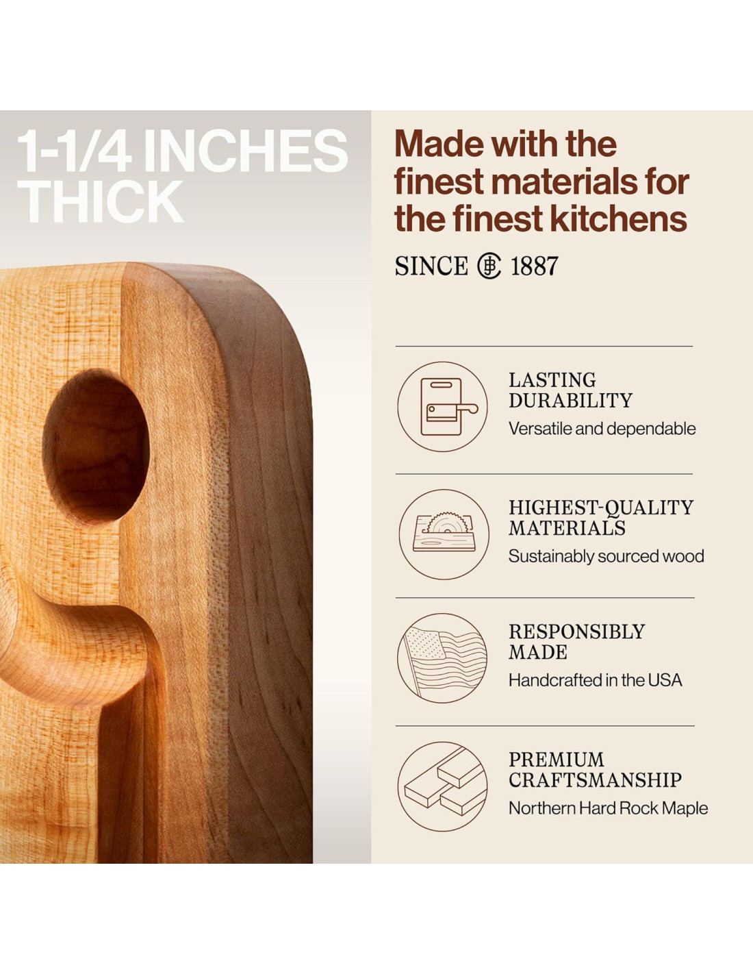 - Fácil Cuidado: Solo lavar a mano. Usa nuestro Aceite Misterioso de Boos Block y Crema para Tabla (se venden por separado) para preservar la belleza natural de la superficie y fibras de la tabla de madera. Consulta nuestra guía de cuidado para más detalles.