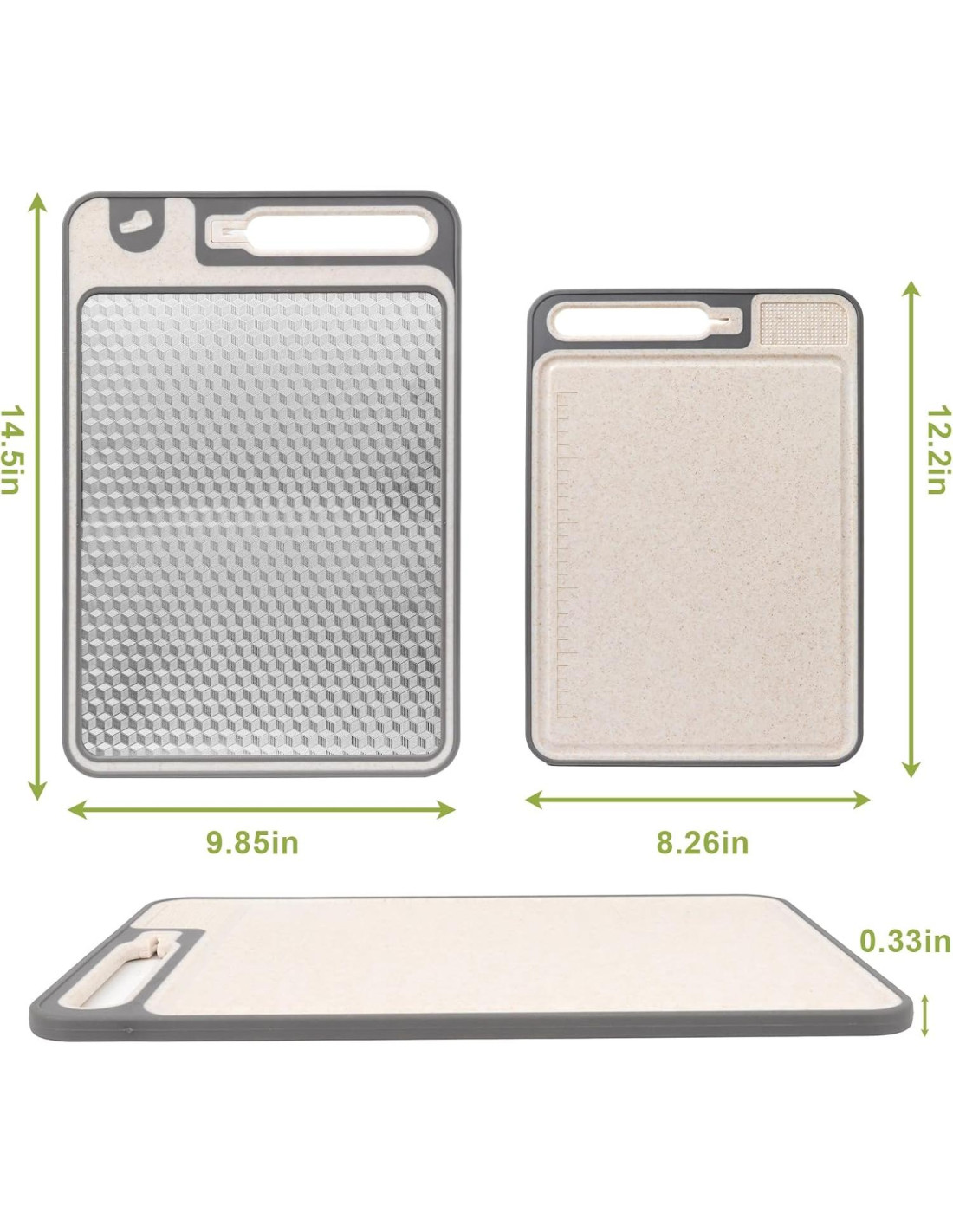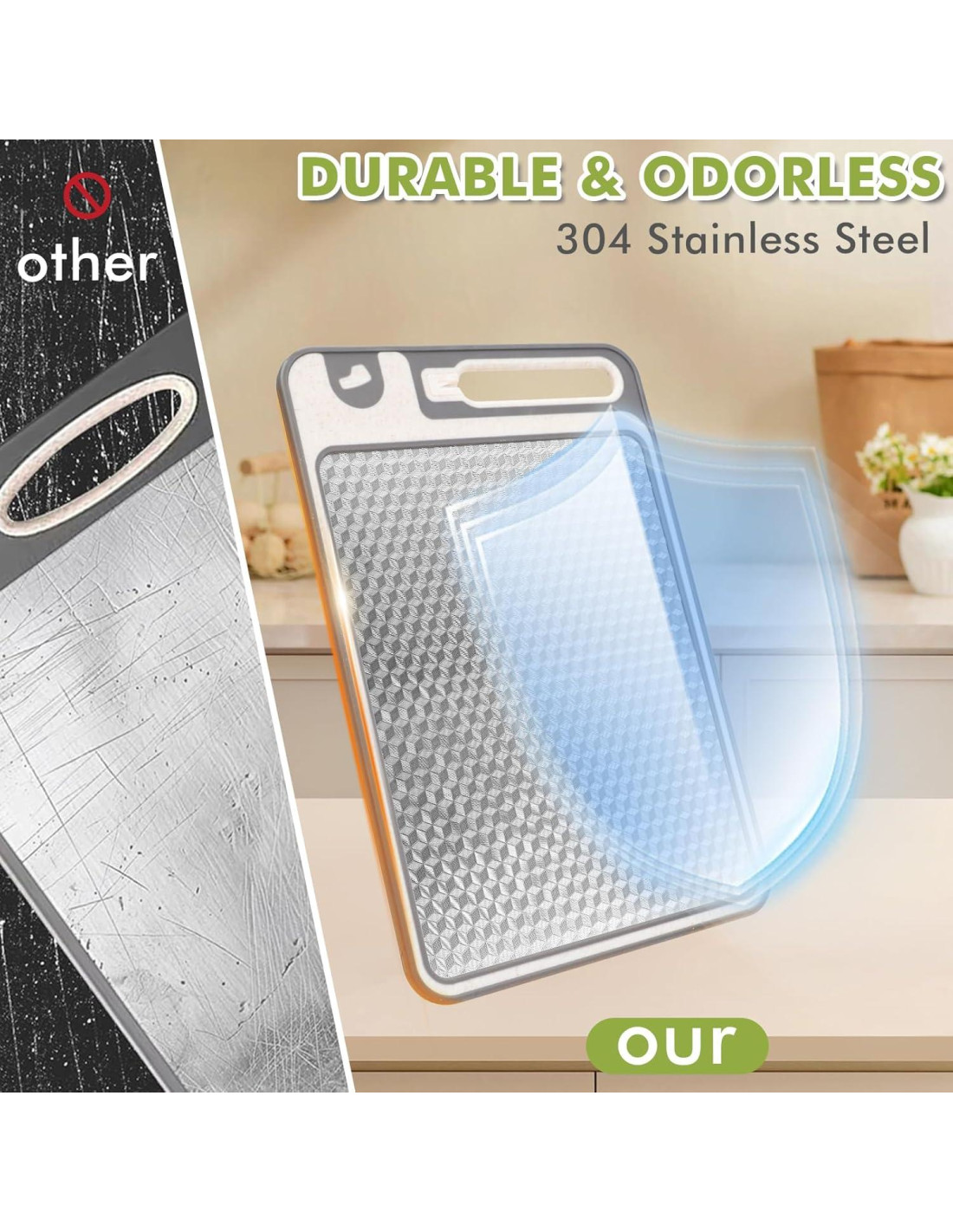 - Diseño de Doble Cara: Lado de acero inoxidable premium para carne/pescado (resistente a olores) + lado de plástico libre de BPA para frutas/verduras.