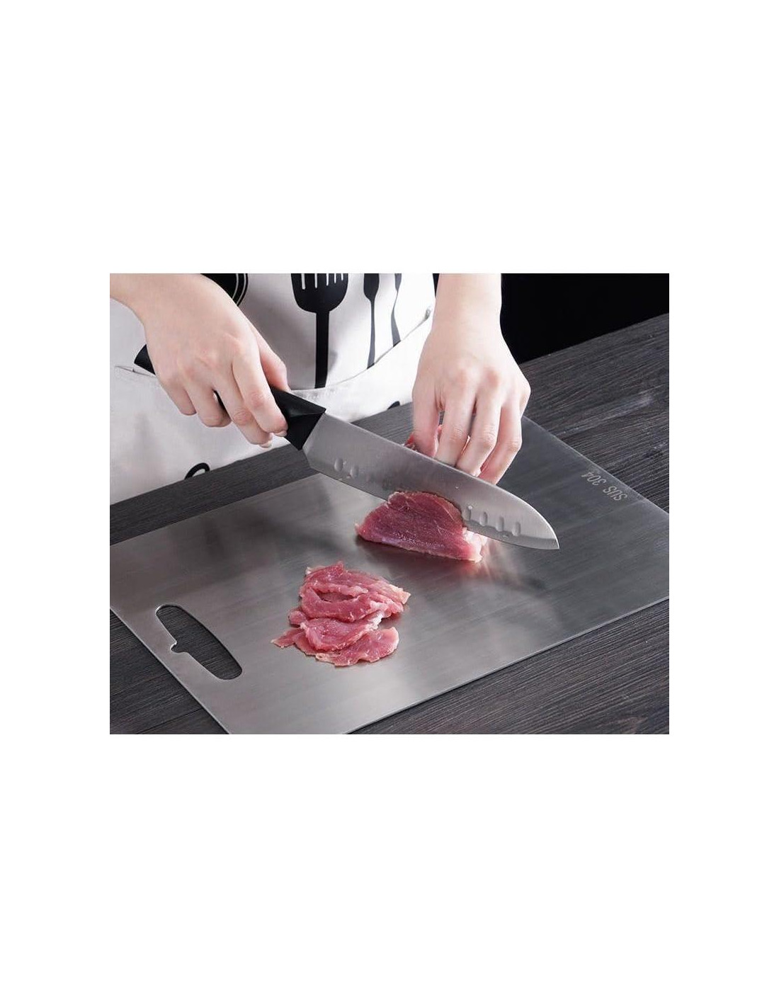 - [Fácil de limpiar] Al usar nuestra tabla de cortar de titanio, puedes deshacerte de las manchas y olores de las tablas de cortar de madera y plástico. Los alimentos y líquidos no se pegarán a la tabla de cortar de titanio. Simplemente enjuágala con agua del grifo y se puede usar nuevamente. El diseño de superficie sin poros significa que se secará inmediatamente.