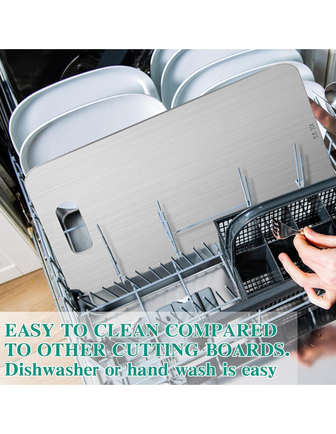 - Fácil de limpiar: nuestras tablas de cortar metálicas antiadherentes son anticorrosión y a prueba de óxido, facilitando su uso en un lavavajillas; Además, son sin costuras y no tienen agujeros y ambos lados no son pegajosos, lo que las hace sin olor residual, fáciles de transportar y colgar