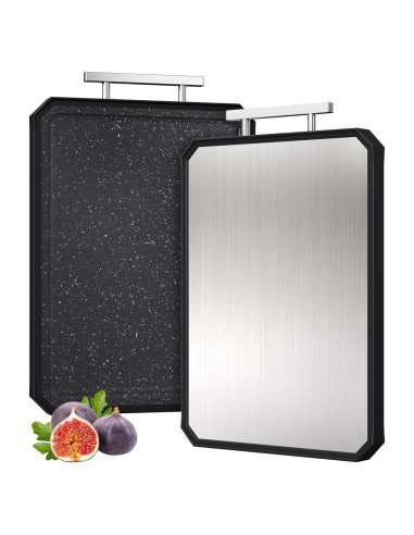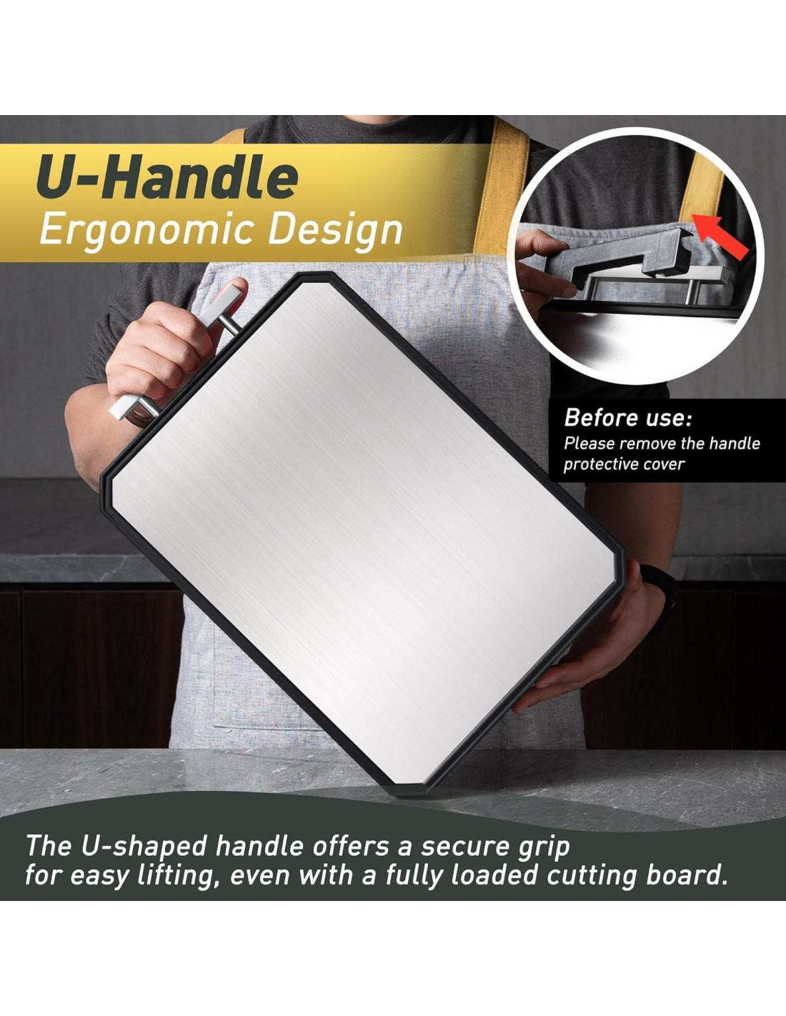 - Corte Doble Cara para Uso Versátil: Las tablas de cortar Socisen para cocina cuentan con un lado de acero inoxidable para cortar carnes y un lado de PP para frutas y verduras. Este diseño de doble cara asegura la seguridad alimentaria y versatilidad, permitiéndole manejar diferentes ingredientes de manera eficiente. Perfecta para la cocina diaria, esta tabla de cortar proporciona una solución de corte duradera y práctica para sus necesidades en la cocina.