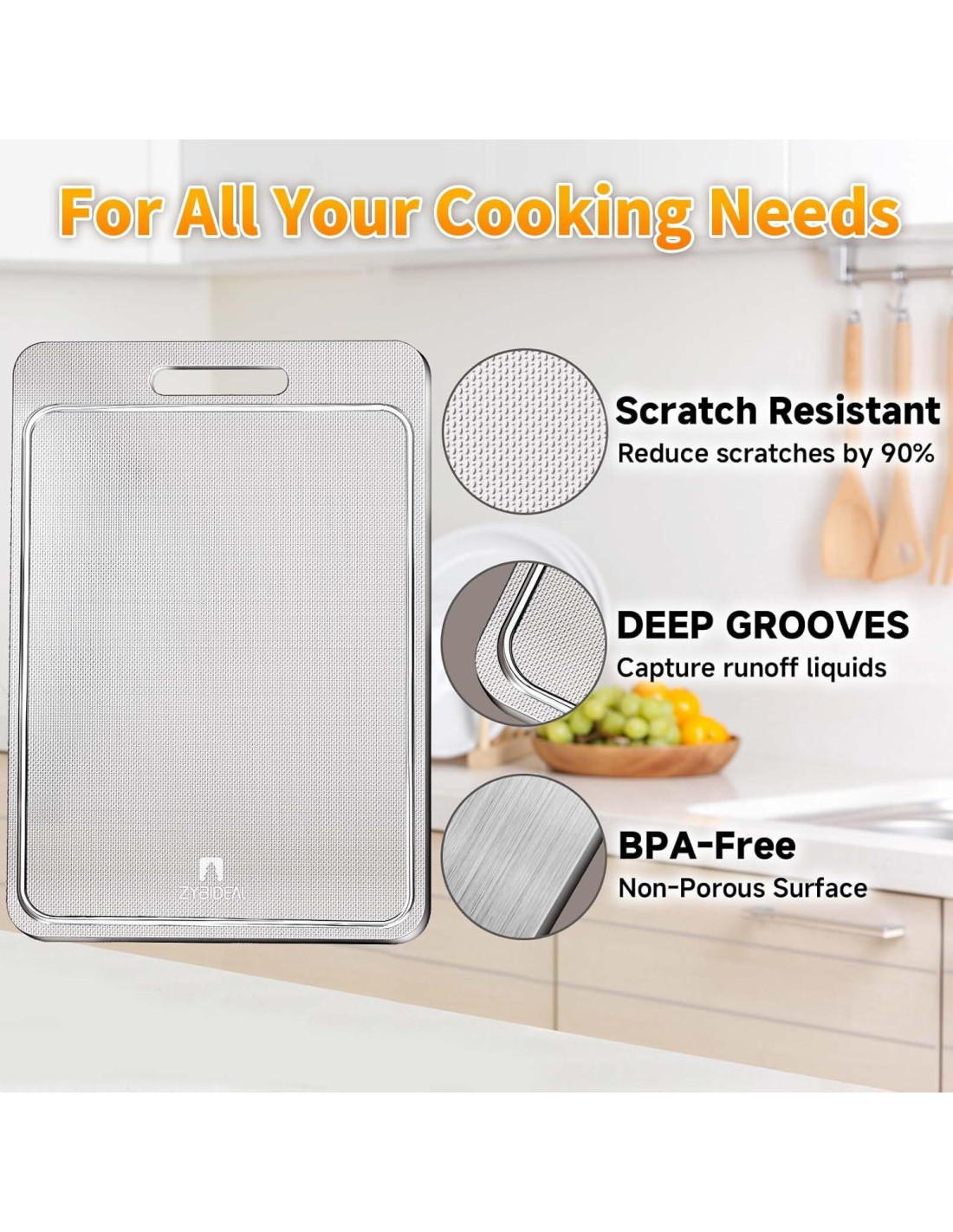 - [2025 Nuevo Diseño Mejorado Resistente a Rayones] Nuestra tabla de cortar está hecha de material de titanio 100%, que es un material ligero que no atraerá olores. En comparación con una tabla de cortar de bambú tradicional, no se agrietará ni se moldeará. Y en comparación con la tabla de cortar de plástico, no producirá residuos plásticos. Es la primera opción para una nueva cocina saludable.