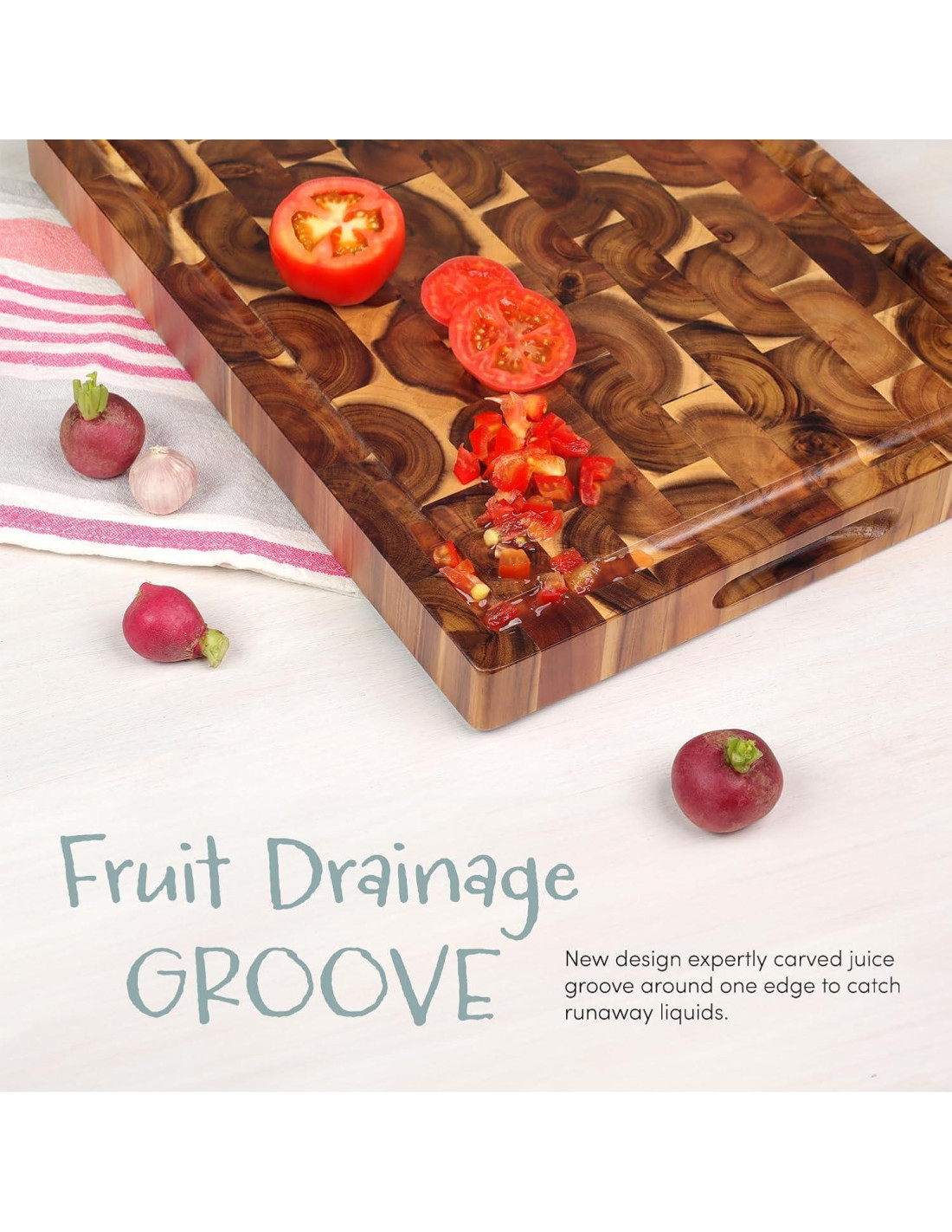 - EXTRA GRANDE Y GRUESA PARA TODAS LAS NECESIDADES DE CORTADO: La tabla de cortar mide 43.2x33x3.8 centímetros. Es grande, gruesa, robusta con madera de grano final. Puede usarse como tabla de cortar, picar, tallar, bloque de carnicero de alta resistencia o bandeja de servir. Con el cuidado adecuado, esta tabla de cortar superará la mayoría de los artículos en tu cocina.