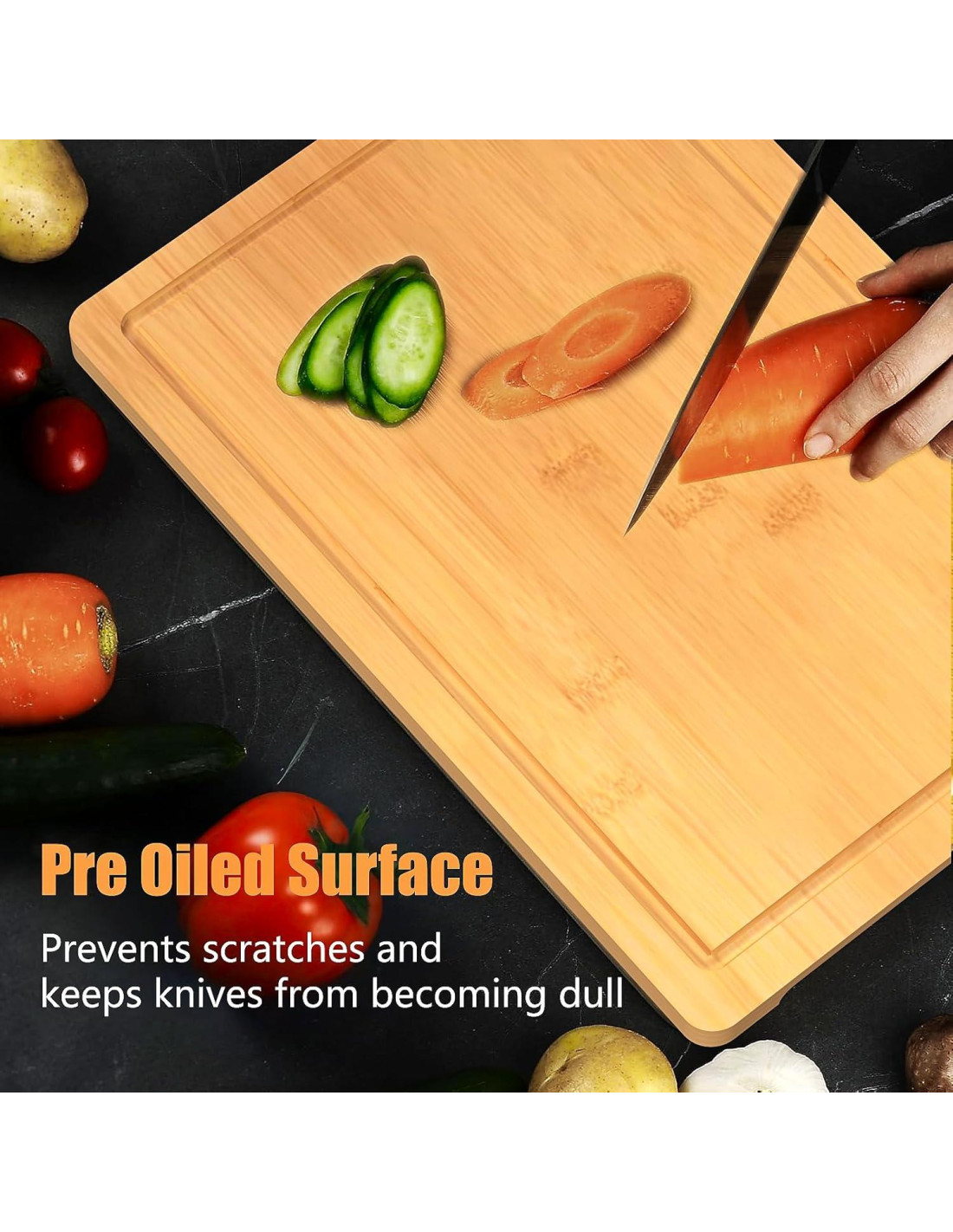 - Superficie Amigable con los Cuchillos: Esta suave madera de bambú es gentil con tus cuchillas, evitando que se desafilen rápidamente, por lo que no tienes que afilarlas tan a menudo. La superficie preaceitada ayuda a prevenir cicatrices, rasguños, manchas y otros signos visibles de desgaste.