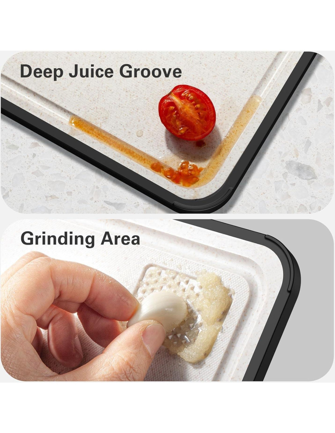 - Gestión de Jugo Elegante - Los canales de borde integrados dirigen sin esfuerzo los líquidos, manteniendo tu tabla de cortar limpia y tu espacio de preparación libre de desorden - un cambio radical para las tablas de cortar para cocina.