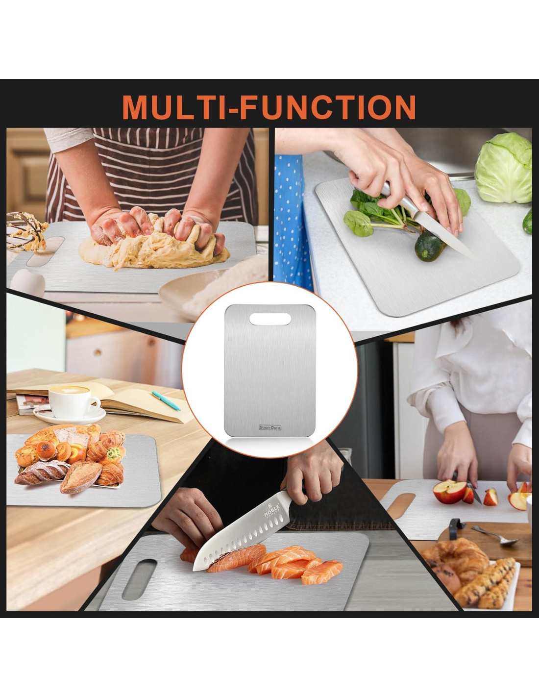 - [Uso Versátil] Esta tabla de cortar de titanio es versátil, se puede usar para cortar carne, pescado, fruta o verduras y también puedes amasar fideos. También puedes usarla como bandeja de servir.
