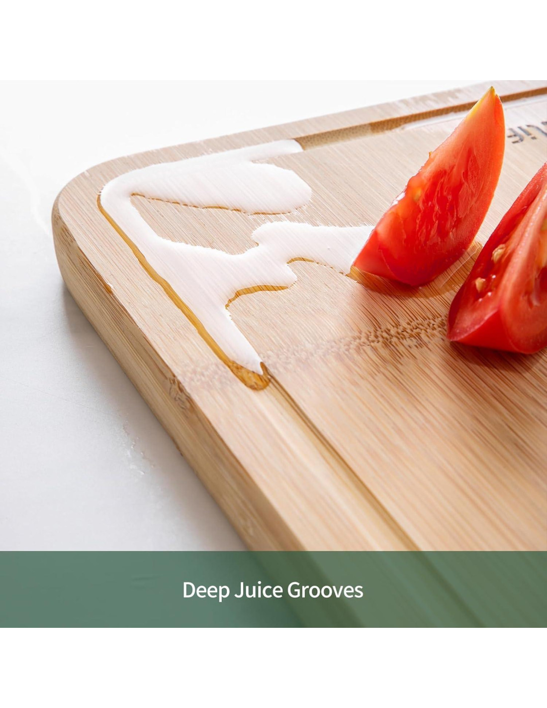 - [Diseño centrado en la conveniencia] : El mango incorporado te permite levantar la tabla de cortar de bambú del mostrador con facilidad, mientras que los mangos integrados hacen que transportar los ingredientes picados a la estufa sea completamente sencillo. Una profunda ranura para jugo rodea el borde, capturando líquidos excesivos y manteniendo tus encimeras fáciles de limpiar.