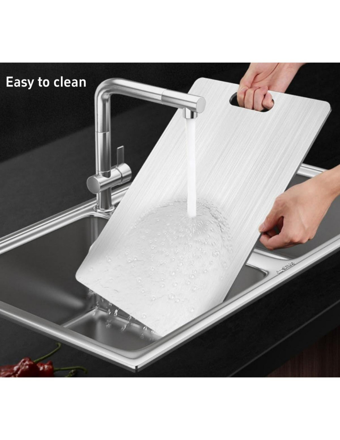 - Extremadamente Fácil de Limpiar: Al usar nuestra tabla de cortar de titanio, puedes deshacerte de las manchas y olores de las tablas de cortar de madera y plástico. Los alimentos y líquidos no se pegarán a la tabla de cortar de titanio. Simplemente enjuágala con agua del grifo y se puede usar nuevamente. El diseño de superficie sin poros significa que se secará inmediatamente.