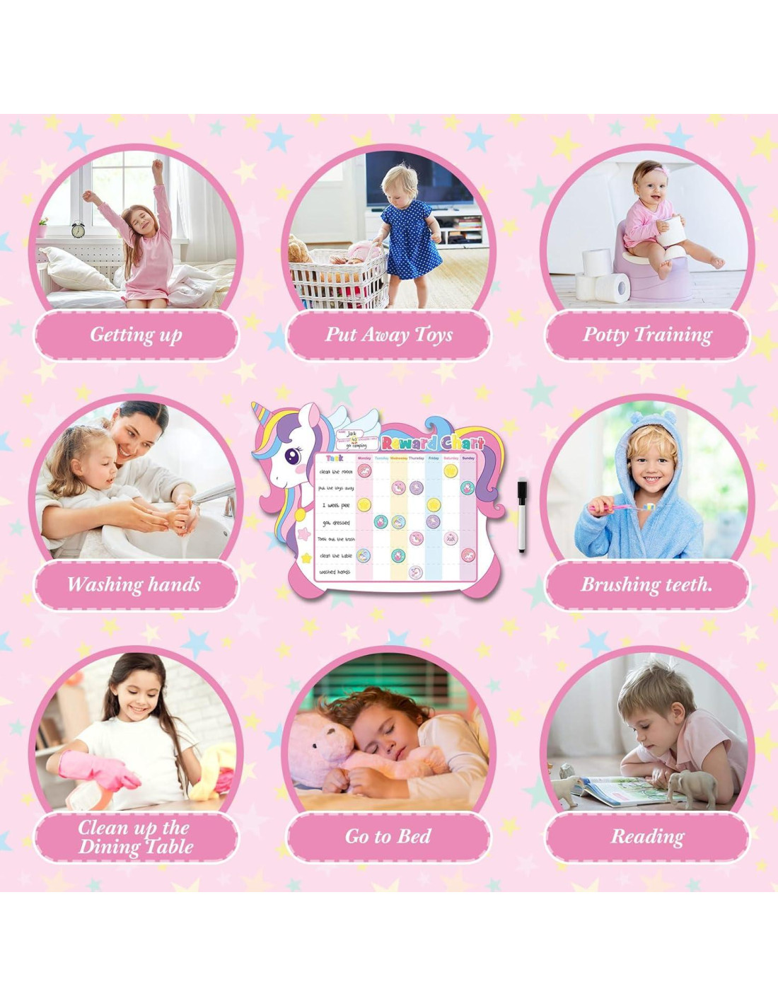 - Personaliza Tu Tarea: la tabla de recompensas de unicornio para niños también incluye un marcador borrable en seco, lo que facilita escribir tareas específicas para que tu hijo las complete; Ya sea que estés trabajando en el entrenamiento para el baño con tu pequeña o enseñándole otras responsabilidades importantes, esta tabla puede ayudar a mantenerla motivada y comprometida.