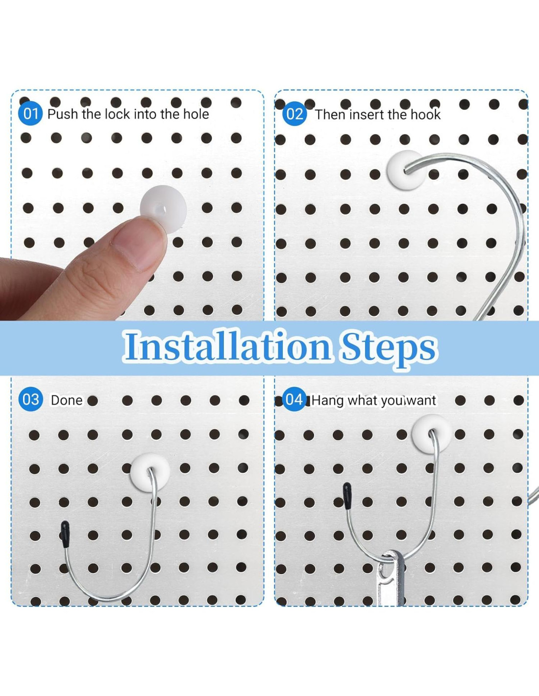 - Fácil Instalación: Simplemente empuja el soporte del tablero perforado en el agujero del tablero perforado. Para mover el gancho, simplemente gira firmemente y el clip del tablero perforado se quita fácilmente para un reposicionamiento sin causar daños