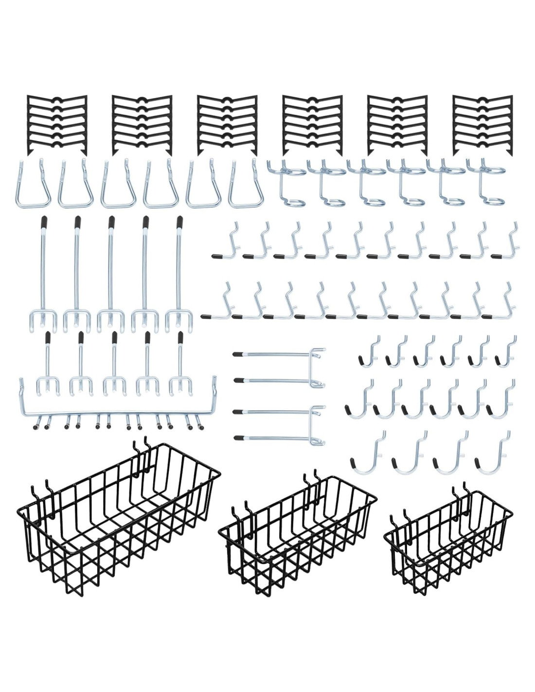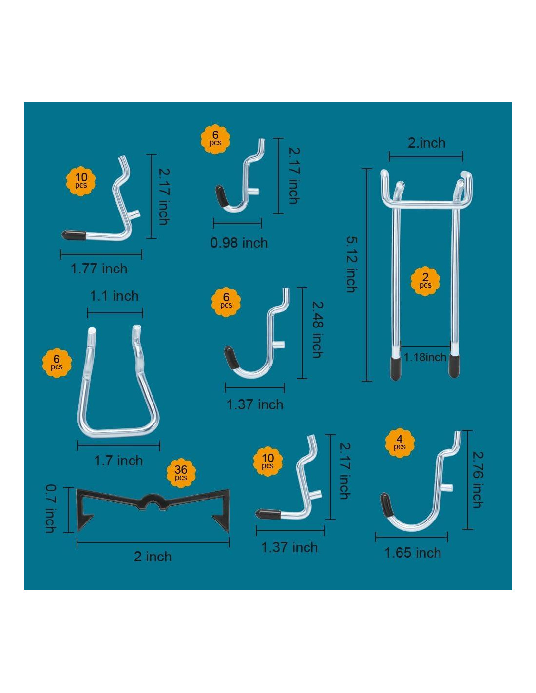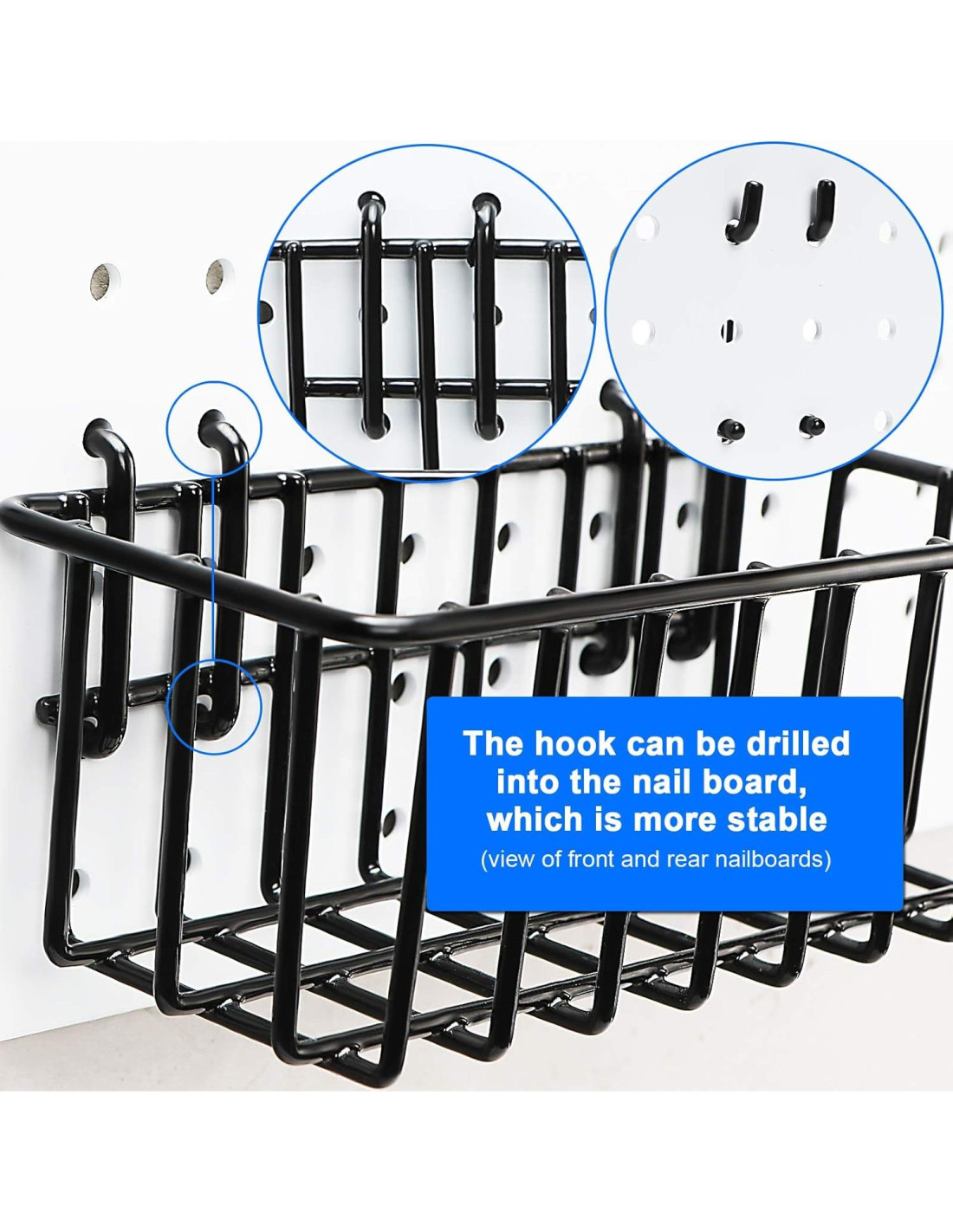 - Tres tamaños de cestas para tablero de clavos y varios ganchos, incluidos ganchos de bloqueo, ganchos diagonales, ganchos rectos, ganchos curvados y estantes para herramientas múltiples. Varios ganchos para tablero de clavos y cestas para tablero de clavos pueden ayudarte a organizar garajes, bancos de trabajo, talleres, cocinas, sótanos, cobertizos de herramientas, fábricas o almacenes. Son perfectos para almacenar herramientas y mantenerlas seguras y limpias.