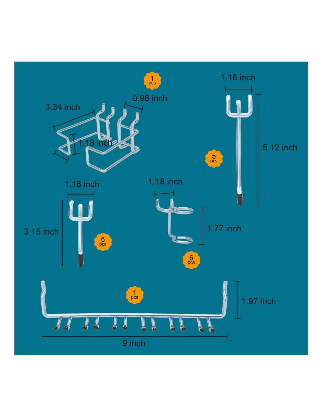 - Nuestros accesorios para tablero de clavos tienen un diámetro extra grueso de 5.5 mm (0.216 pulgadas), solo adecuados para tableros de clavos con agujeros de 1/4 de pulgada y separación de 1 pulgada. Cada gancho pequeño está equipado con un bloqueo de gancho y también soldado con un pasador estabilizador, que fija firmemente el gancho del tablero de clavos en el tablero de clavos sin caerse fácilmente.