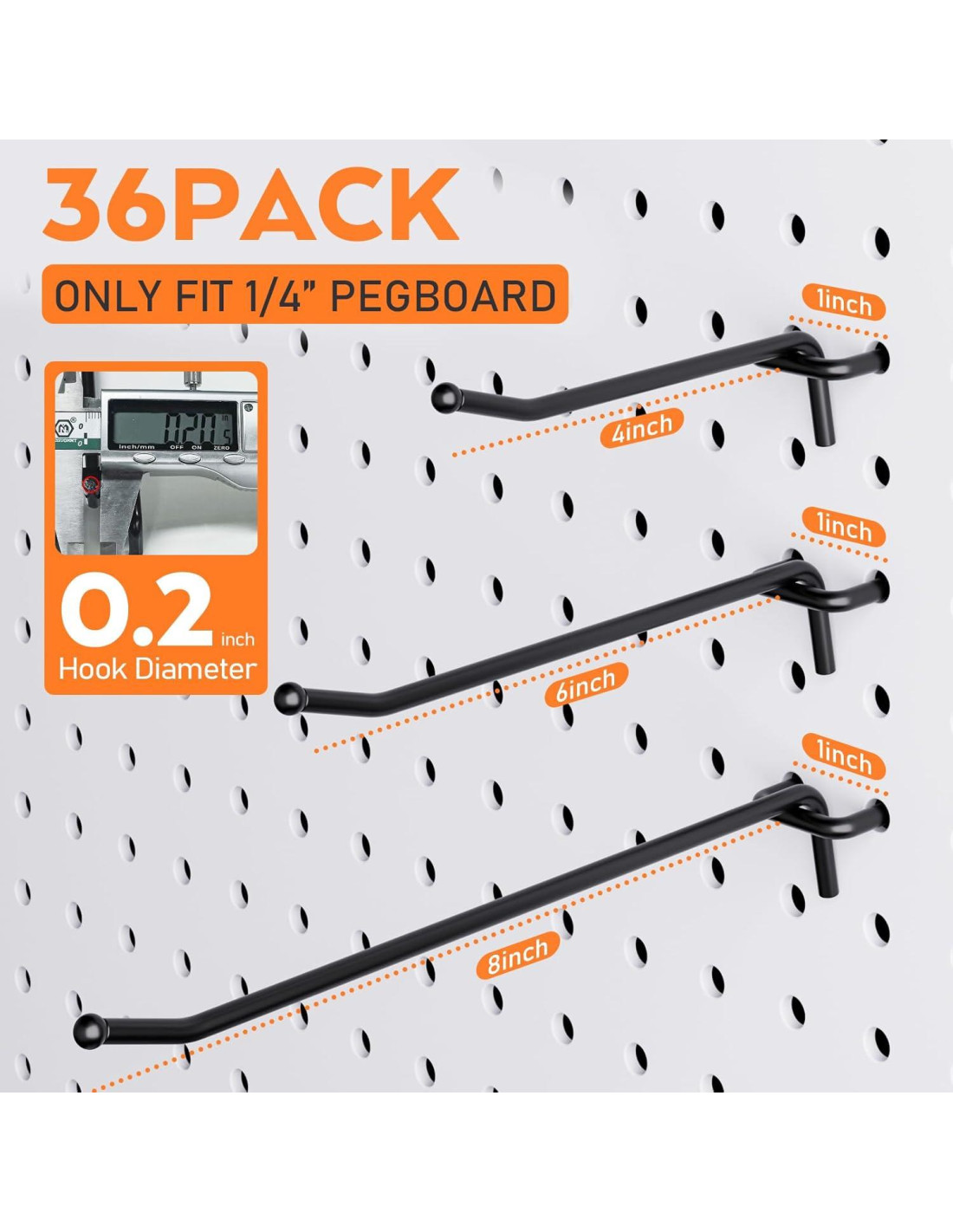 - GANCHO PARA TABLERO DE CLAVOS PARA COLGAR: El kit de accesorios para organizar tableros de clavos viene con 36 ganchos de tablero de clavos en 3 tamaños (4/6/8 pulgadas), cada tamaño tiene 12 ganchos. El diseño en forma de L de una sola pieza es más fuerte y más estable. El extremo redondeado protector evita rasguños y es más seguro