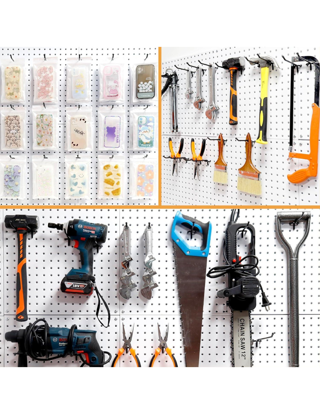 - RESISTENTE Y DURADERO: Los ganchos en forma de L para tablero de clavos están hechos de material de alta calidad que permite que nuestros ganchos para tablero de clavos soporten 30 libras (13.6 kg) de herramientas pesadas durante mucho tiempo sin caerse.