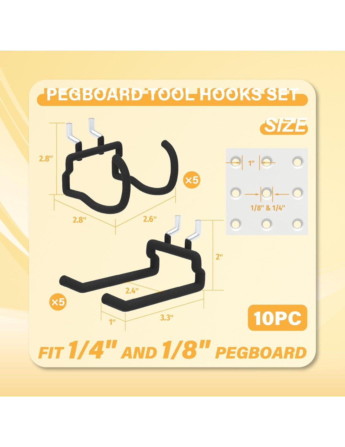 - Diseño de Ajuste Perfecto - Diseñados específicamente para tableros de clavos de 1/4" (6.35 mm), estos ganchos para tableros de clavos aseguran un ajuste seguro y sin problemas. Los ganchos para colgar están diseñados para proporcionar una solución de almacenamiento estable y organizada para sus herramientas y accesorios.