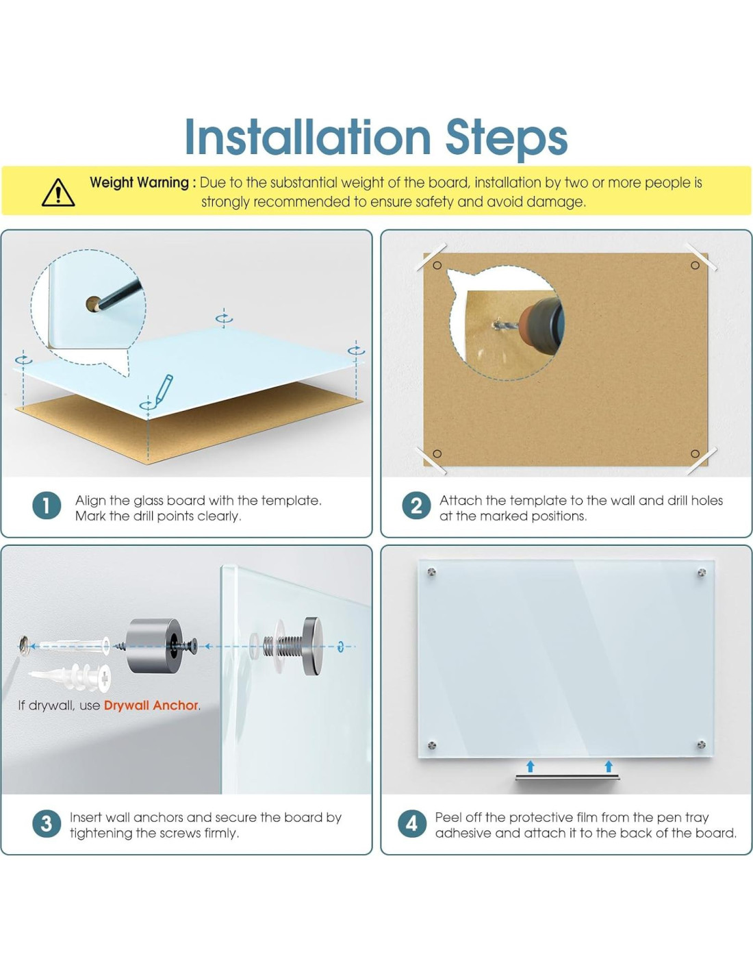 - Instalación Rápida y Fácil - Mide 122 cm x 91 cm. Incluye plantilla de instalación, bandeja de accesorios, borrador de pizarra blanca magnética, 4 marcadores y 6 imanes fuertes para pizarra de vidrio. Aviso de Peso: Debido a su peso, se recomiendan dos o más personas para una instalación estable y para prevenir daños