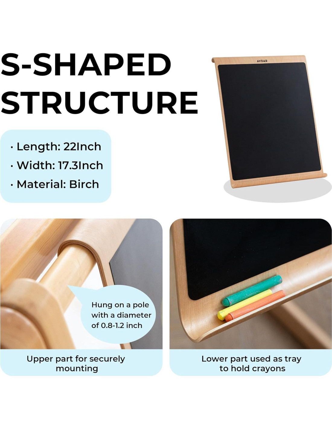 - Diseño en S: Este tablero de dibujo para niños no tiene soporte adicional, lo que lo hace muy liviano. El diseño en S, con dimensiones de 55.9 centímetros (largo) y 43.9 centímetros (ancho), presenta un borde enrollado en S en la parte superior para estabilidad y un borde enrollado en S en la parte inferior que se puede usar como bandeja para sostener suministros de arte, permitiendo a los niños un fácil acceso durante el proceso de dibujo.