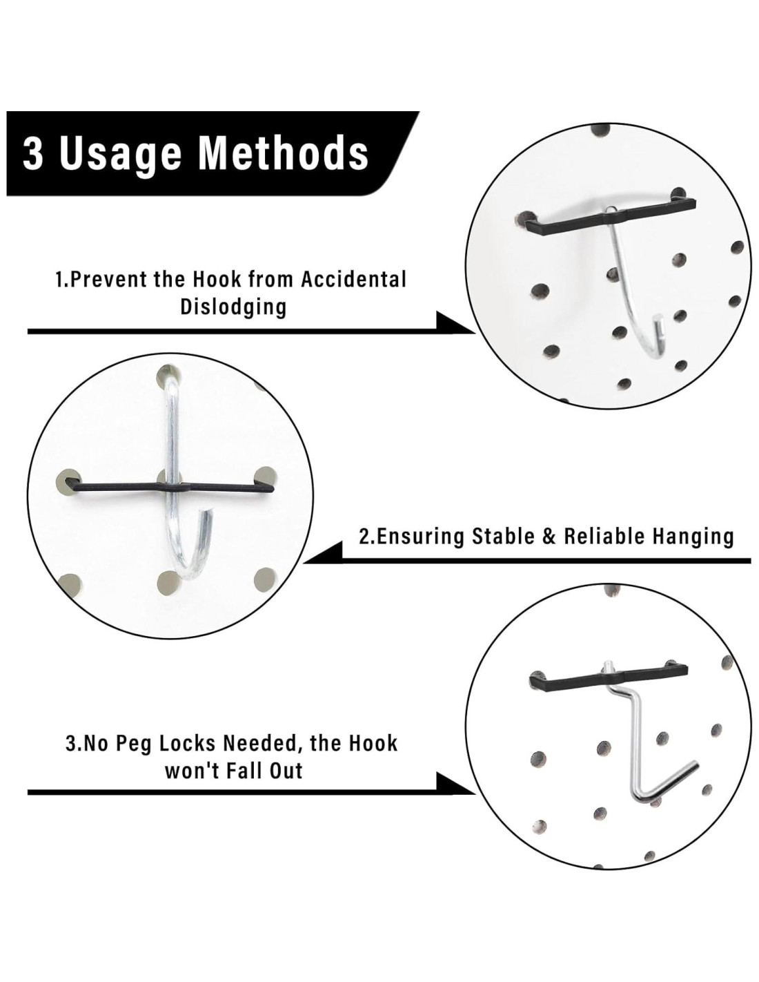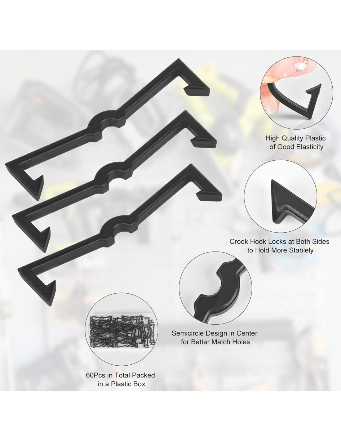 - Bloqueos de Gancho de Clavo de Plástico: El bloqueo de gancho de tablero de clavos está hecho de plástico de alta calidad, duradero, sólido, ligero pero conveniente de usar y almacenar. Los retenedores de ganchos de tablero de clavos tienen buena elasticidad para instalar en el agujero del clavo.