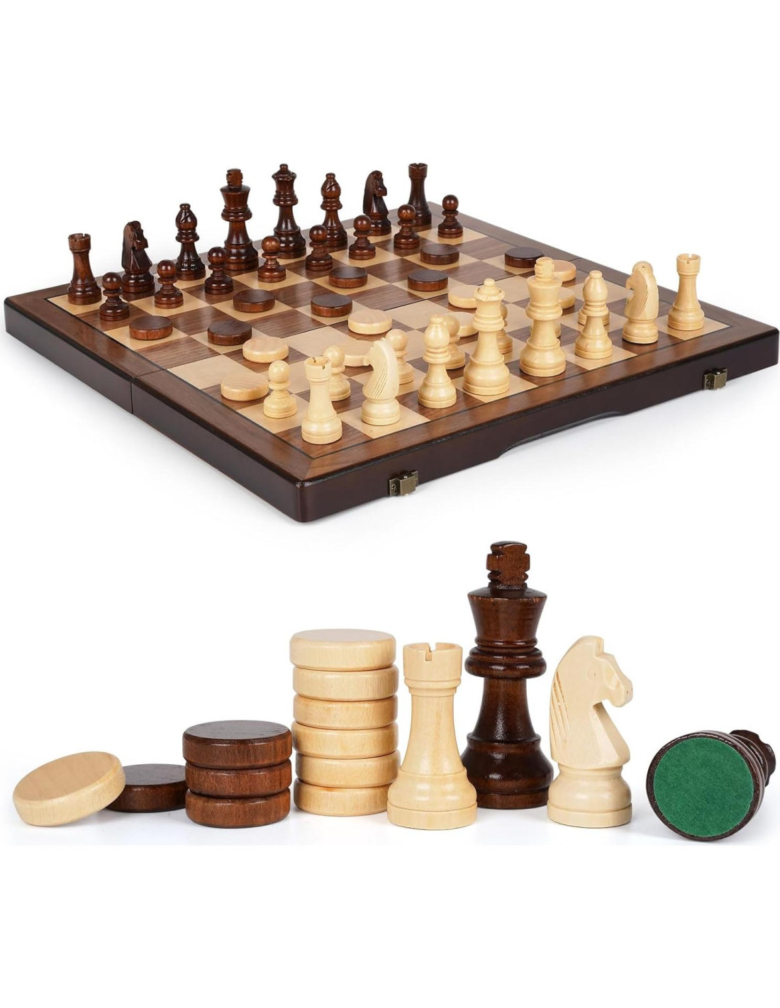 - PIEZAS DE AJEDREZ EXQUISITAS - Cada pieza de este set de ajedrez y damas Staunton está elaborada de madera maciza de alta calidad por artistas experimentados para detalles perfectos y sin fallas y el mejor tacto. Este set contiene 24 damas y piezas completas incluyendo 2 reinas extra. El rey mide 3 pulgadas (7.6 cm) de altura para un mejor agarre para las personas que aman las piezas de ajedrez grandes.