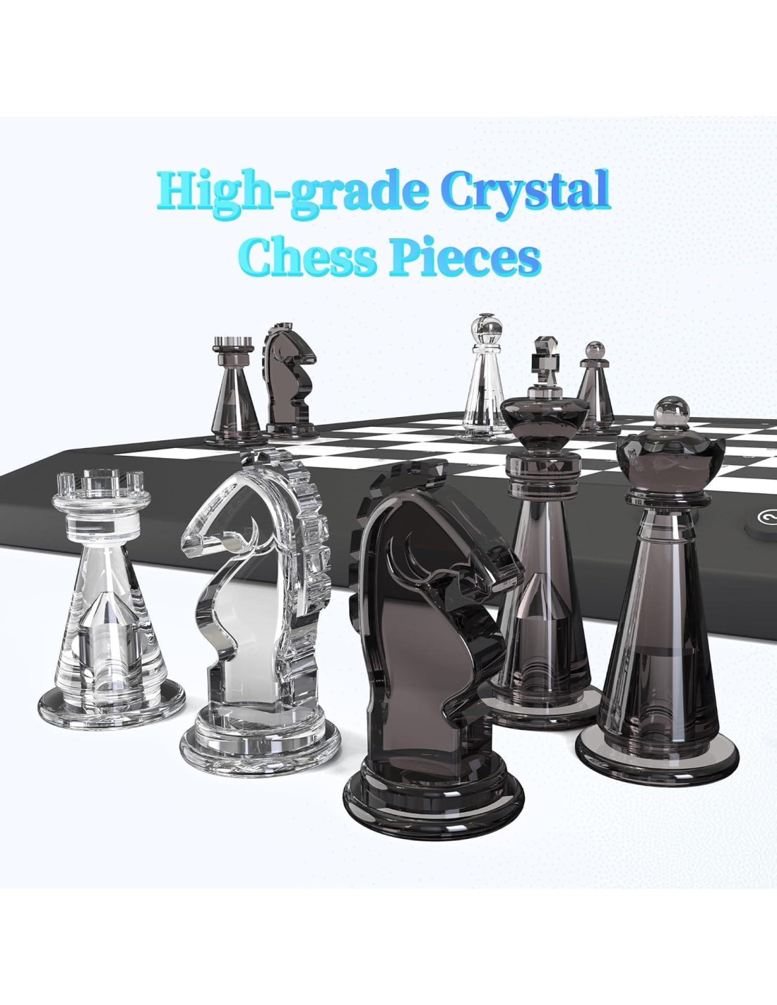 - [Compañero de Viaje] Femuey P6 está diseñado como un tablero ligero y moderno con Piezas de Ajedrez de Cristal de Alta Calidad, lo que te permite jugar, practicar y disfrutar del juego de mesa más popular del mundo en cualquier momento y lugar.