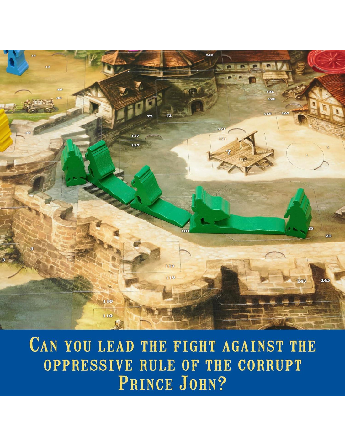 El año es 1193, y el condado de Nottingham, Inglaterra, está sufriendo bajo el opresivo dominio del corrupto Príncipe Juan y sus secuaces. En este juego de mesa cooperativo familiar, los jugadores asumen los roles de Robin Hood y sus Hombres Alegres mientras luchan contra los malvados gobernantes de la ciudad y a lo largo del Bosque de Sherwood. Diseñado e ilustrado por Michael Menzel, el galardonado creador de la serie de juegos Legends of Andor, este juego cuenta con un tablero de juego bellamente ilustrado que cambia a lo largo del juego y un hermoso libro de historias encuadernado en imitación de cuero de 216 páginas que narra la historia y avanza la jugabilidad. Una mecánica de juego innovadora permite mover libremente las figuras de los personajes por el tablero; no es necesario seguir una ruta establecida. El tablero de juego también tiene paneles interactivos que se voltean para revelar personajes ocultos y nuevos elementos de juego durante la partida. A medida que avanza tu búsqueda, abres estos paneles y hablas con varios personajes que alteran tu curso. Un juego de inicio rápido en el libro de reglas te lanza sin esfuerzo a la acción. ¡Toma tu arco y flecha y únete a la lucha por la justicia y la equidad!