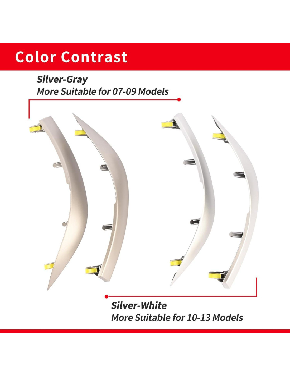 - [Descripción del color]: El color de las piezas decorativas originales de los modelos 2010-2013 es más cercano al blanco plateado, mientras que el color de los modelos 2007-2009 es más cercano al gris plateado. Aparte de la diferencia de color, son mutuamente compatibles, y puedes elegir el color que te guste según tus necesidades.
