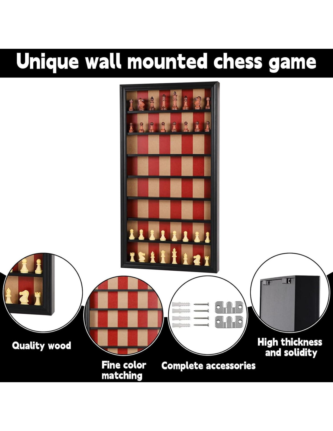 - [Diseño Colgable] El soporte de ajedrez vertical se puede colgar en la pared, lo que no solo no ocupa espacio, sino que también sirve como decoración para la habitación. No solo puedes colgarlo en la pared para jugar ajedrez, sino que también puedes colocar ordenadamente nuestras piezas de ajedrez cuando no están en uso, convirtiéndolo en un marco de ajedrez de madera bellamente tallado que es muy conveniente.