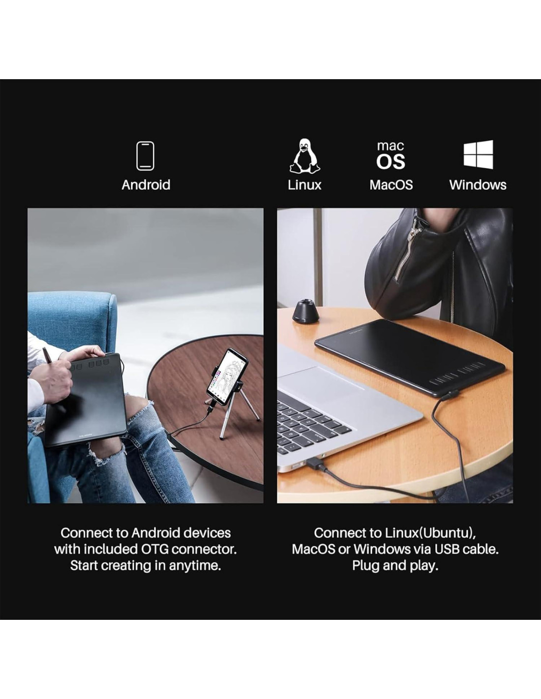 - [Compatibilidad Multi-SO]: La tableta gráfica H640P funciona con Mac, Windows y Linux PC, así como con teléfonos inteligentes o tabletas Android (versión de SO 6.0 o posterior). También está disponible para usuarios zurdos.