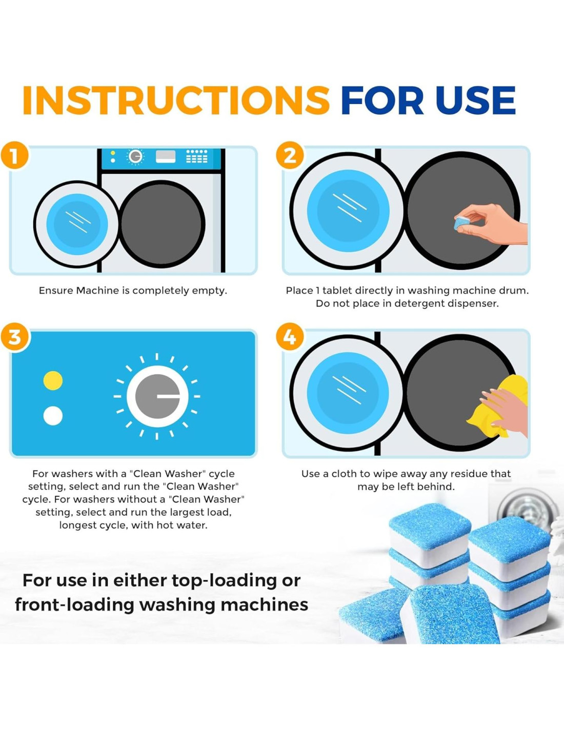 - Fácil de Usar: Simplemente deja caer una tableta en el tambor, ejecuta un ciclo caliente sin ropa, y deja que la tableta se disuelva para liberar una espuma limpiadora que alcanza cada rincón de tu máquina.