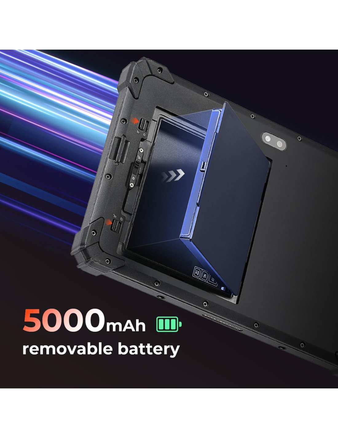 - [Batería Removible] Con una batería removible de alta capacidad de 5000mAh, esta tableta reforzada asegura un tiempo de uso prolongado y un mantenimiento sin complicaciones. El diseño innovador permite cambios rápidos de batería sin necesidad de un destornillador, haciéndola perfecta para turnos largos y entornos de trabajo dinámicos. Mantén tus operaciones funcionando sin problemas y de manera eficiente con un tiempo de inactividad mínimo.