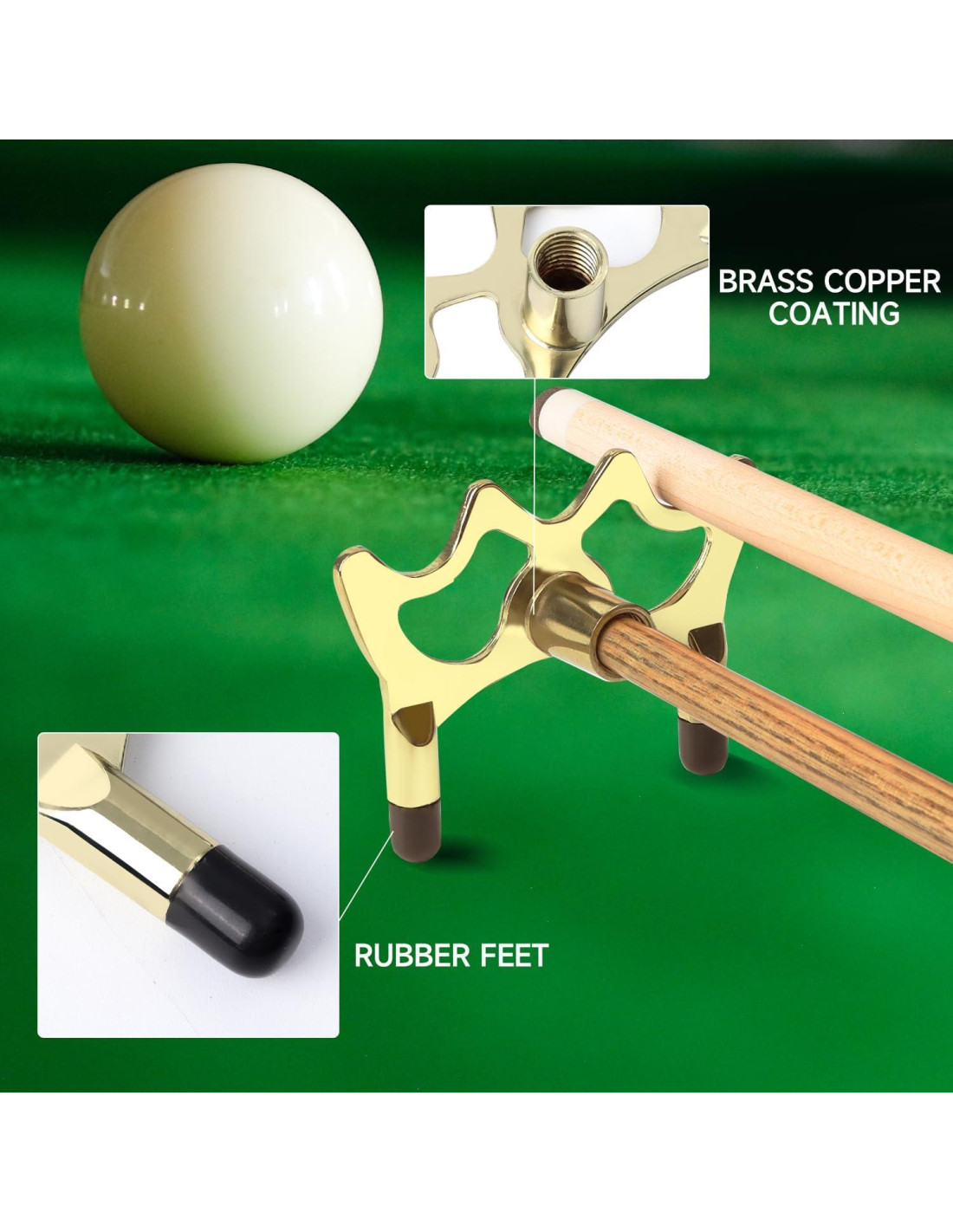 - Material: El cabezal de puente de billar está hecho de aleación de zinc y tiene un recubrimiento de cobre; la superficie está pulida para asegurar un deslizamiento fácil y suave, manteniendo tu palo de billar sin signos de desgaste