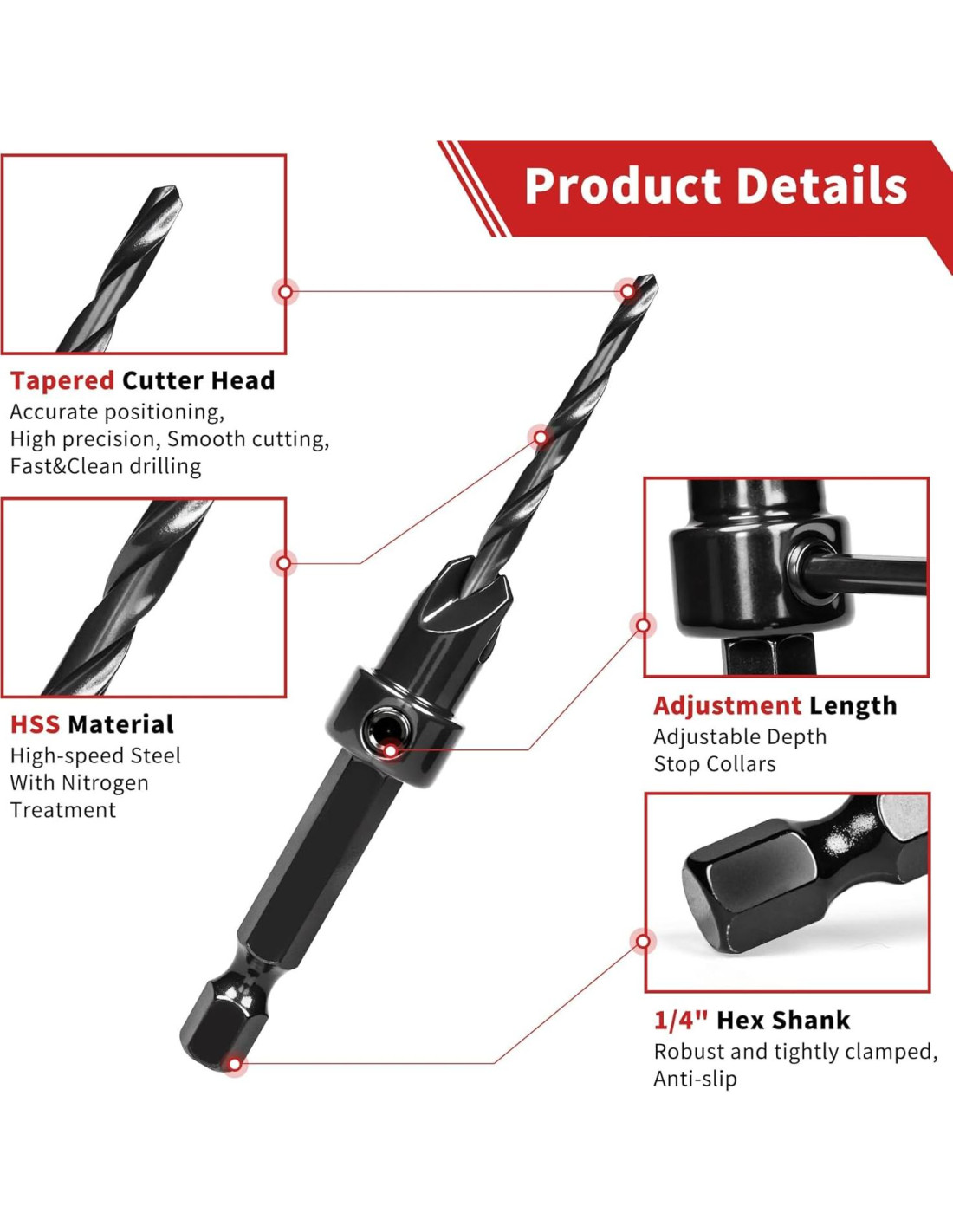 - Solución integral de carpintería de 15 piezas: Diseñada para una versatilidad completa en proyectos, el juego de brocas de avellanado TEWORDA de 15 piezas incluye brocas cónicas: 2 piezas #4 (7/64"), 2 piezas #6 (9/64"), #8 (11/64"), #10 (3/16"), #12 (7/32"), cortadores de tapones de madera (3/8", 1/2"), 2 piezas anillos de parada de profundidad (3/8" y 1/2"), 2 piezas de puntas de destornillador Phillips (PH1/PH2), 1 pieza de eje de extensión y 1 pieza de llave Allen, todo organizado para su uso inmediato