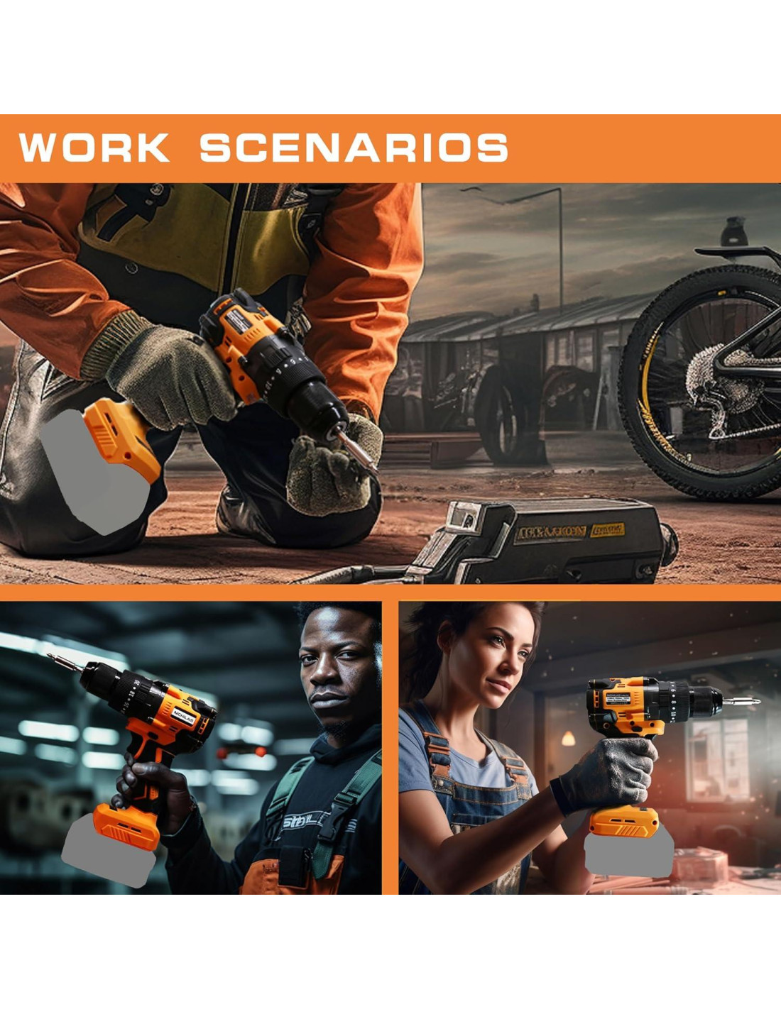- TIPO DE TRABAJO 3 EN 1: Taladro inalámbrico con 3 tipos de trabajo. Tipo martillo con impacto, trabaja para concreto profesional, ladrillo, pared y material duro; tipo perforación trabaja para madera, plástico y material blando; tipo atornillado trabaja para tornillos con ajuste de torque 1-20, cambio rápido adecuado para cualquier trabajo.