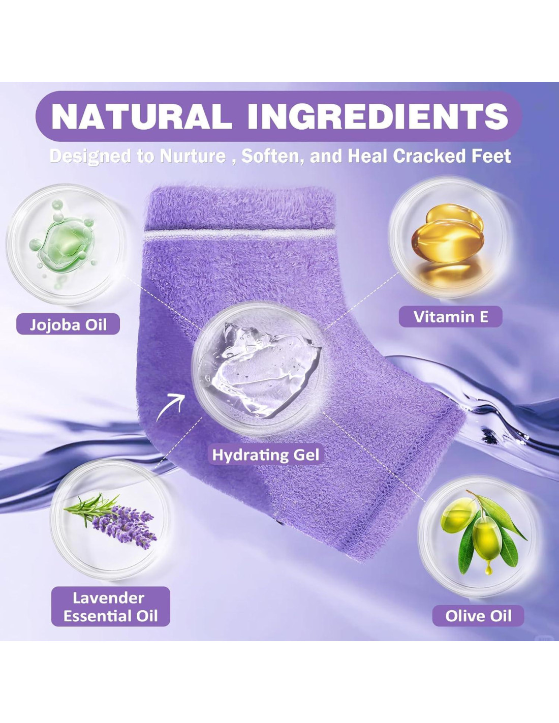 - Gel Avanzado con Hidratantes Naturales Nuestro tejido ultra difuso, que puede desprenderse ligeramente, no afecta la comodidad. El forro de gel avanzado infusionado con Aceite de Jojoba, Vitamina E, Aceite de Oliva y Aceite Esencial de Lavanda, retiene la humedad, manteniendo los pies frescos y secos. Ideal para el tratamiento de talones agrietados y eczema.