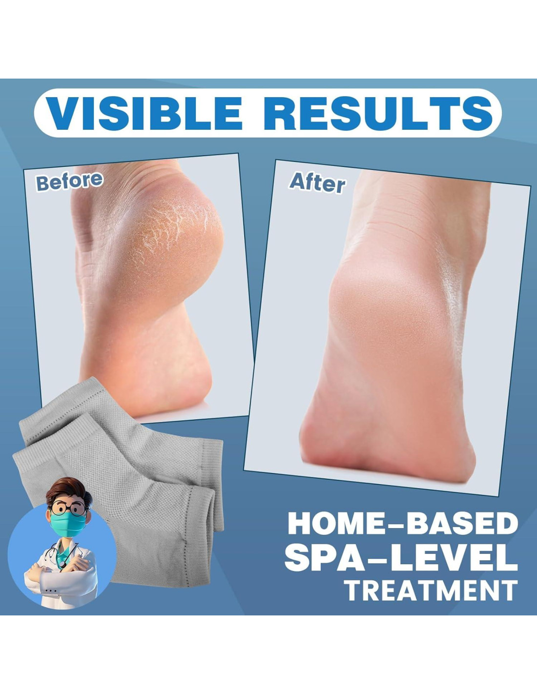 - [PAQUETE DE CUIDADO DE PIES VALIOSO] Recibirás 6 pares de calcetines para talones adecuados para pies secos y agrietados en gris, negro, púrpura, azul, rosa y verde. No más necesidad de productos costosos para el cuidado de los pies. Al usar consistentemente estos calcetines de terapia de gel hidratante, tus pies se volverán más suaves e hidratados.