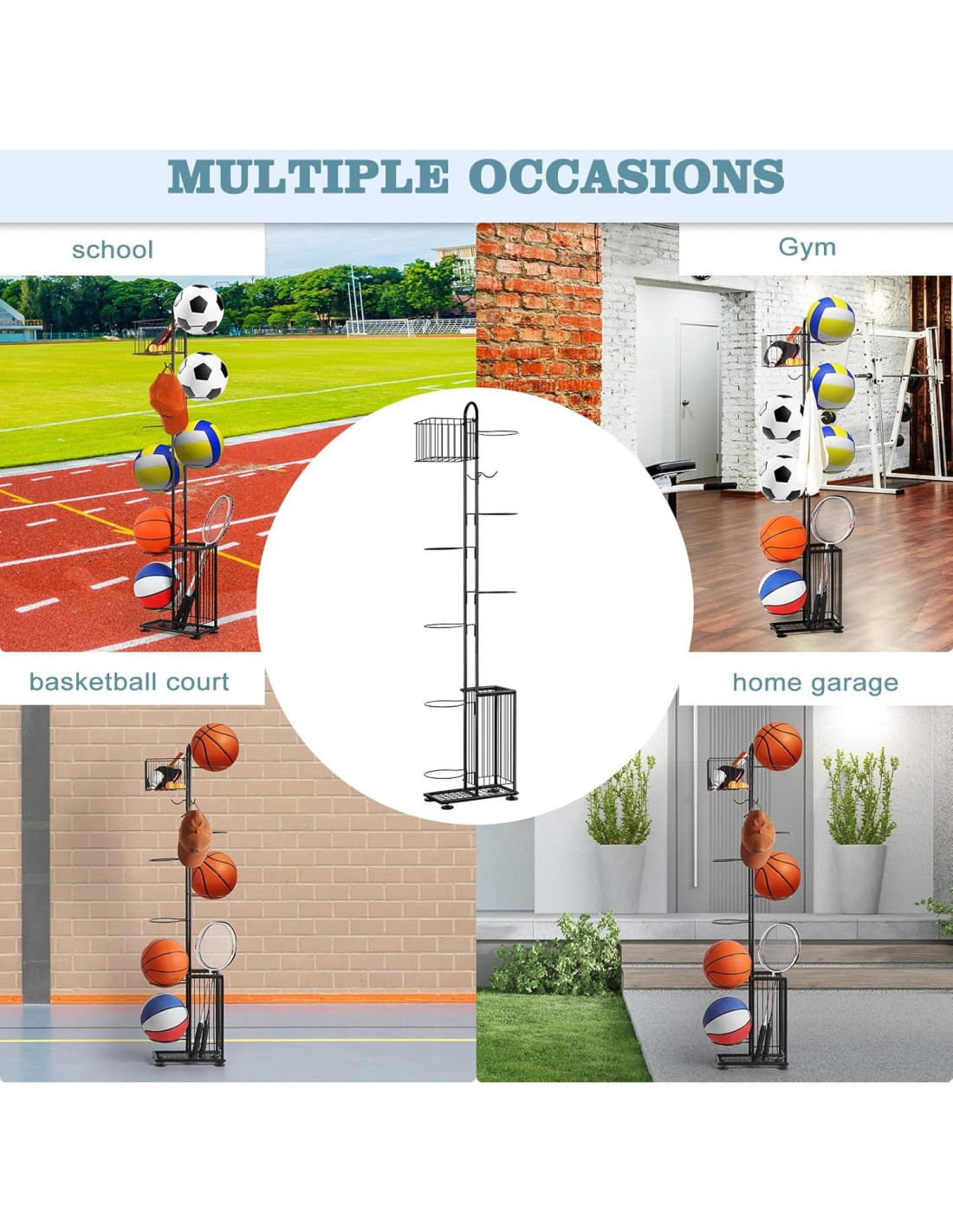 - [ESTANTE DE ALMACENAMIENTO MULTIFUNCIONAL PARA BALONES DE BALONCESTO] : Equipado con dos cestas, la cesta para raquetas puede sostener algunos balones pequeños para tenis, bádminton o rugby y artículos como rodilleras, y el nivel inferior puede sostener bates de béisbol, así como raquetas de softbol, raquetas de tenis, raquetas de bádminton, raquetas de pickleball y otros equipos deportivos.