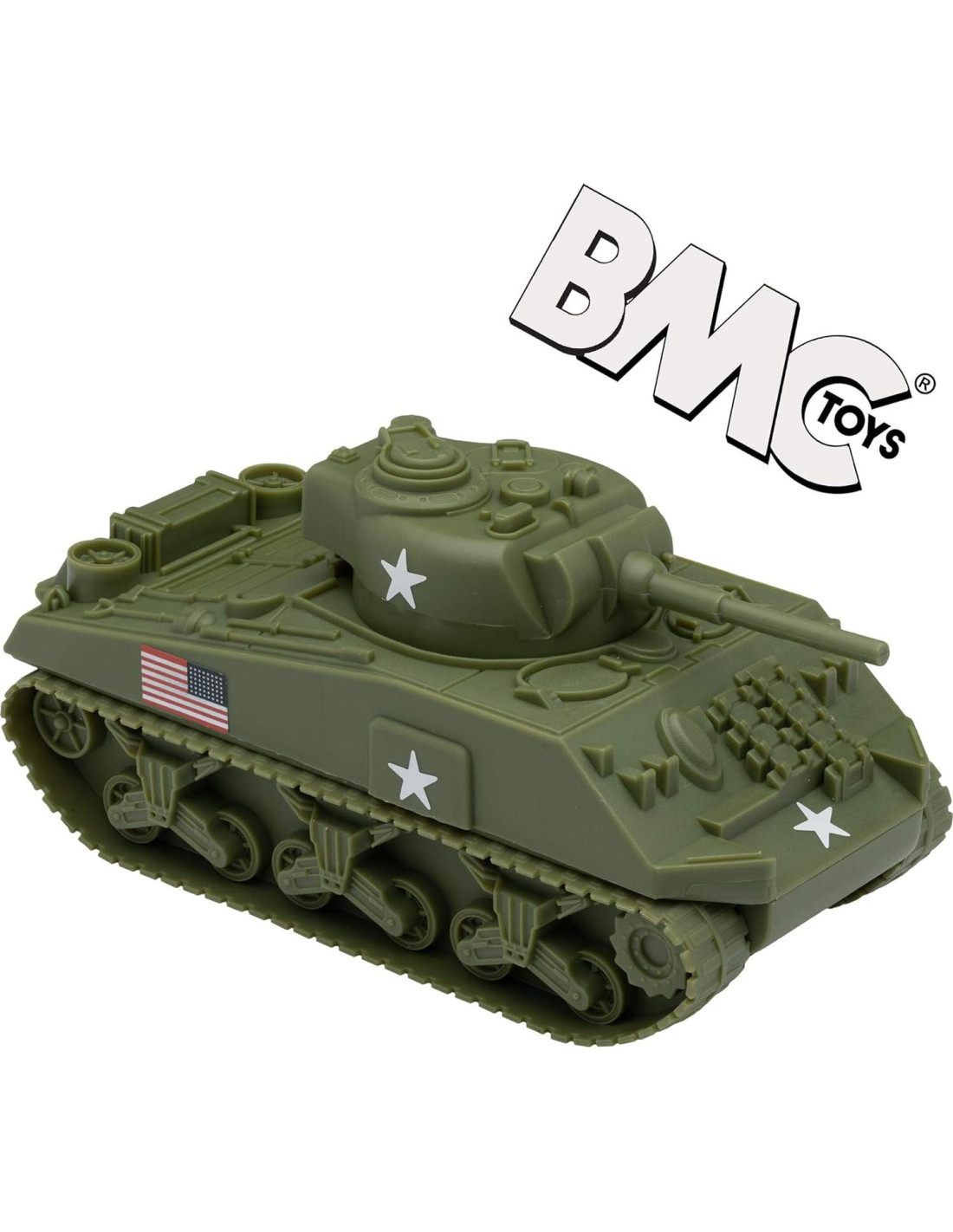 De la serie AMERICAN HERO COLLECTOR de BMC Toys, el tanque de trabajo de los Aliados: El TANQUE SHERMAN M4 tiene muchos detalles auténticos y cuenta con una torreta que gira. Hecho de plástico polipropileno verde oliva muy duradero y rígido, con muy poco desecho, mide 19.05 x 8.89 x 9.53 centímetros de alto y es a escala 1:32 (54mm). La designación oficial de este tanque es Tanque Medio, M4. Se produjeron más de 50,000 durante la Segunda Guerra Mundial, y el Tanque Sherman estuvo involucrado en casi todos los teatros operativos de la guerra. BMC Toys fue fundada por Bill McMaster en 1991 y se especializa en producir figuras de soldados de plástico históricamente precisas, conjuntos de juego y accesorios en el estilo clásico de las décadas de 1950 y 1960. Empacado en una bolsa de polietileno simple y recomendado para mayores de 5 años. La versión de 2017 presenta una nueva hoja de calcomanías opcional.