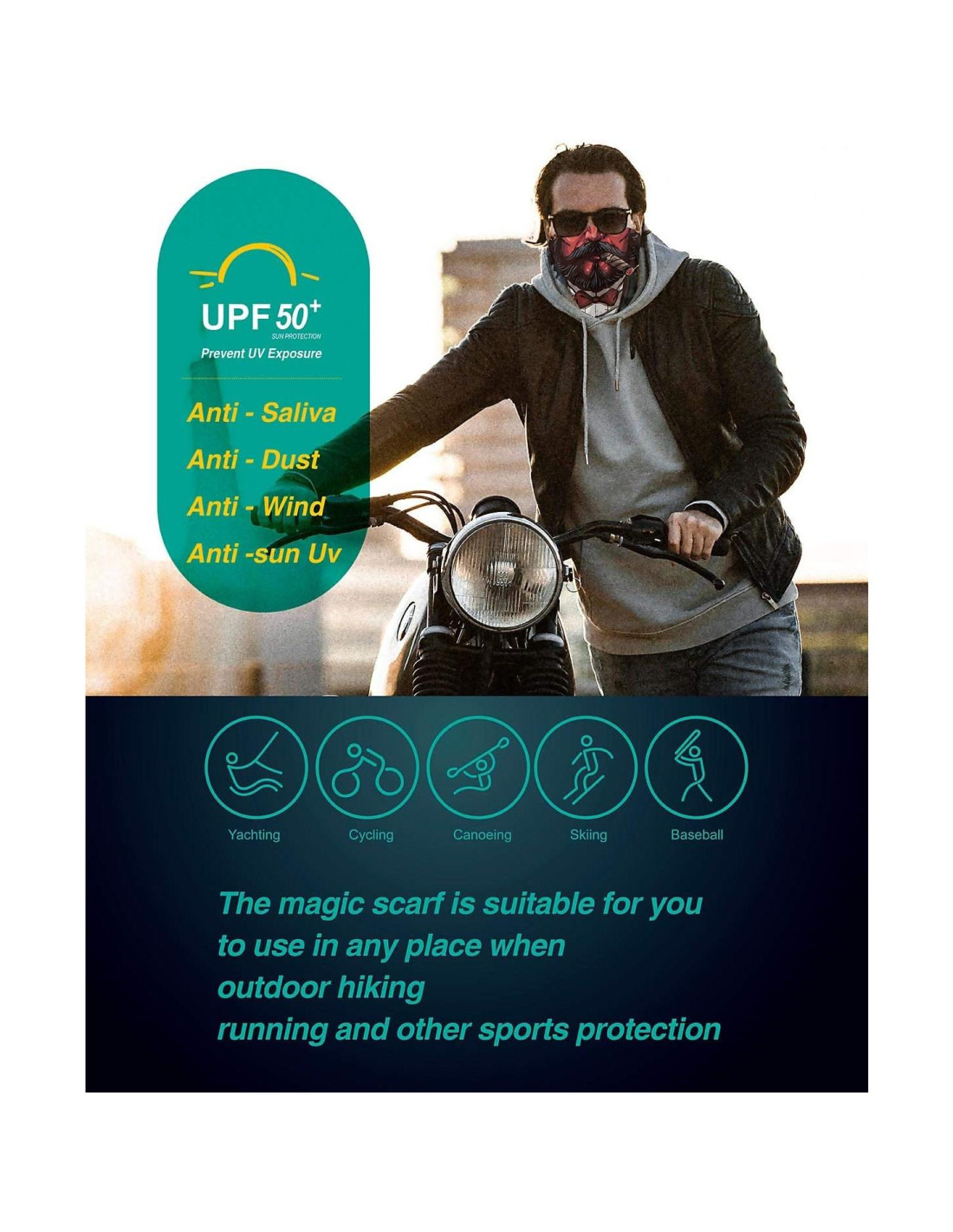 Ocasiones Aplicables Hay más de 18 formas diferentes de usar, se puede usar como pañuelo para la cabeza, diadema, máscara para los ojos, toalla, pasamontañas, banda para el cabello, banda para el cuello, bufanda para el cuello, brazalete, pulsera, cinturón, bufanda, máscara, pañuelos, accesorios para el cabello, forros de casco, gorros, sombreros, etc. Se puede usar como una mascarilla protectora diaria, también adecuada para ocio y diversas ocasiones deportivas, como yoga, correr, senderismo, acampada, escalada, pesca, esquí, fitness, ciclismo, motocicleta, caza, etc.
