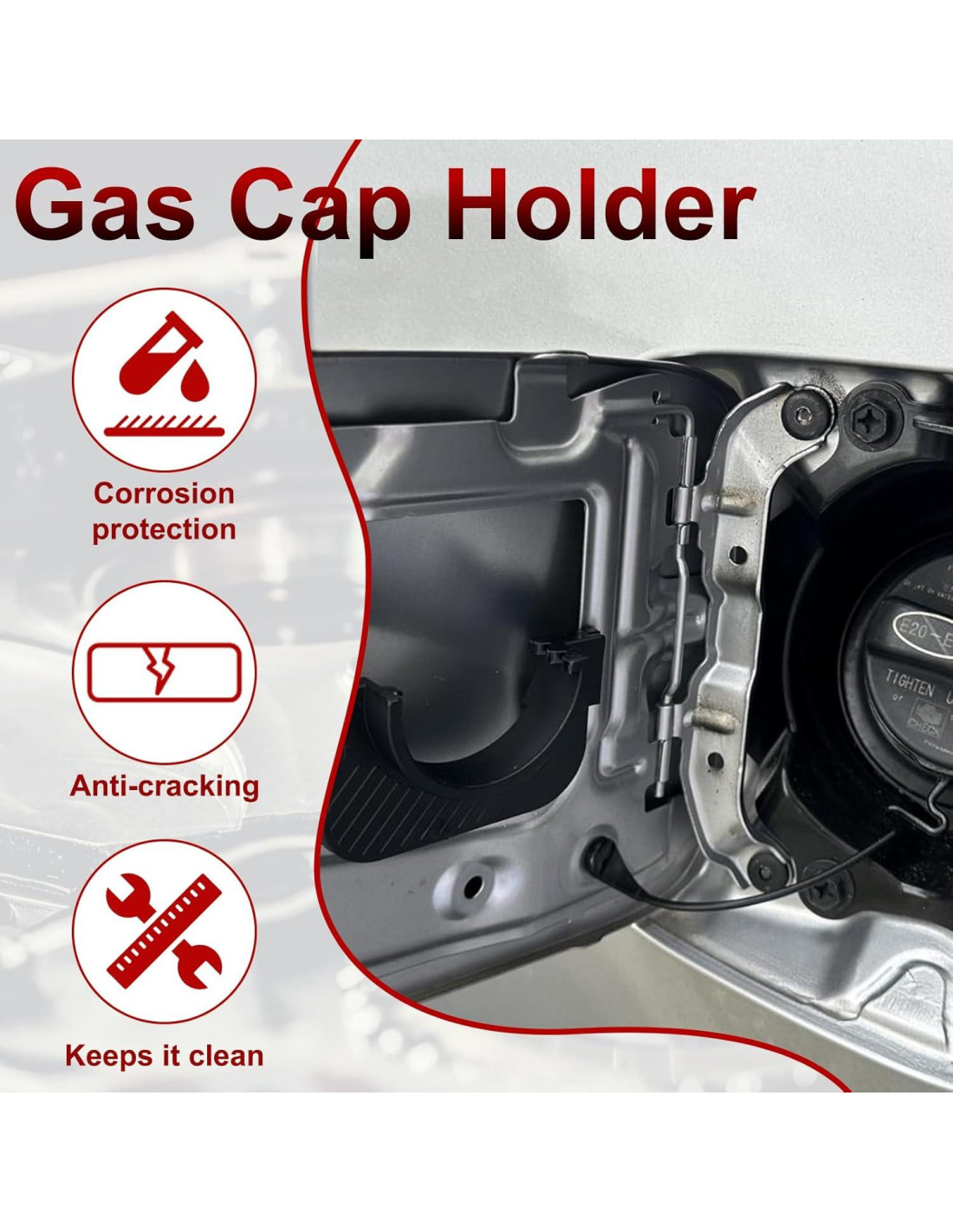 - Fácil de instalar: Paso 1: Desenrosque los tornillos de la puerta del tanque de combustible. Paso 2: Luego, ajuste el soporte de la tapa de combustible a lo largo del pequeño hueco en la puerta del tanque de combustible. Paso 3: Finalmente, reinstale los tornillos y termine. Si los tornillos no se pueden quitar, use un lubricante removedor de óxido (como WD40) en los tornillos para ayudar