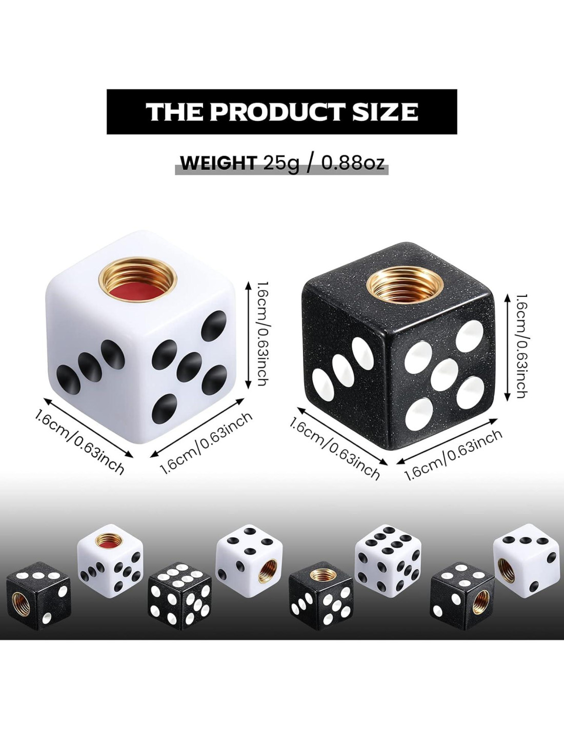 - Paquete incluido: recibirás 4 piezas de tapones de válvula de neumático estilo dado blancos y 4 piezas de tapones de válvula de neumático estilo dado negros, son 0.63 x 0.63 pulgadas (1.6 x 1.6 cm)