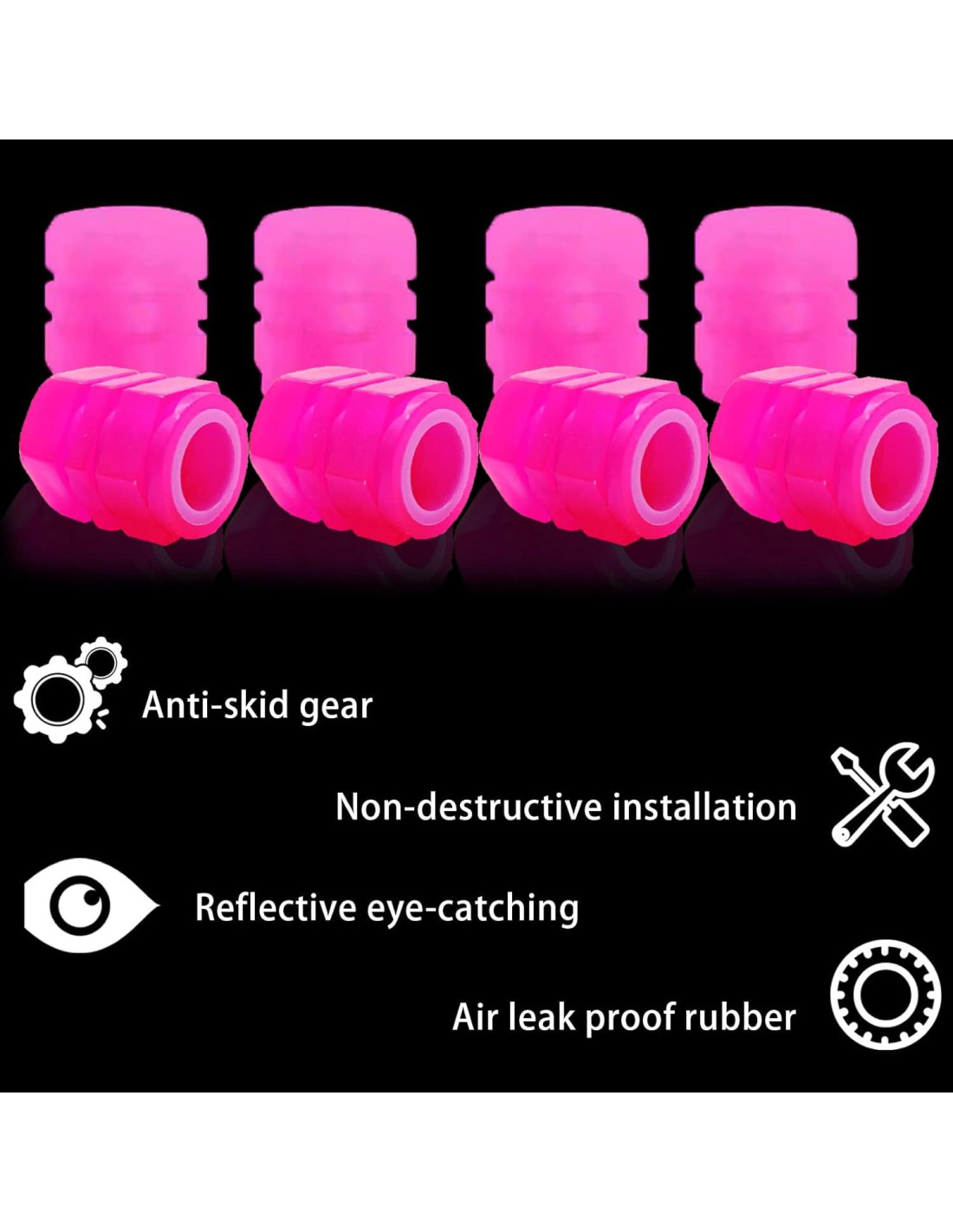 - Cubierta de neumático luminosa: Esta cubierta de neumático está hecha de ABS de alta calidad, que absorbe luz durante el día y se ilumina automáticamente por la noche y protege la válvula, evitando que el agua, el polvo o la arena entren en el neumático; previniendo fugas de válvula y asegurando una conducción segura.
