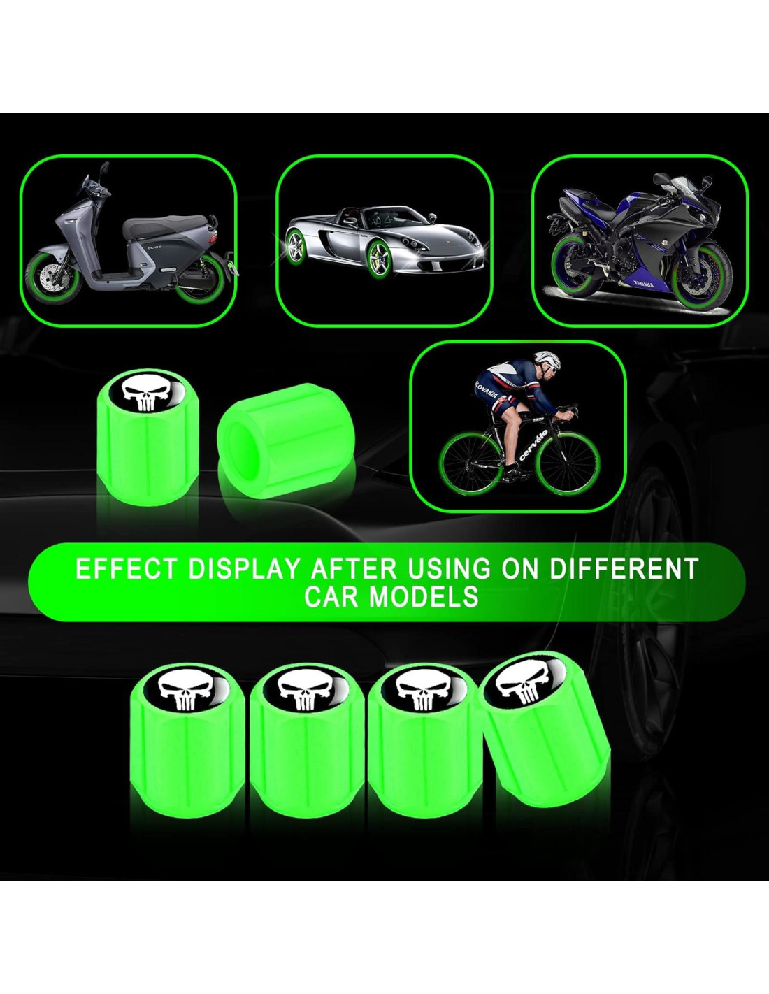 Ajxn 4 PCS Tapas de Válvula de Neumático de Coche con Diseño de Calavera, Cubiertas de Aire Luminiscentes, Universales para Coches, Bicicletas, SUVs, Camiones y Motocicletas (Verde)