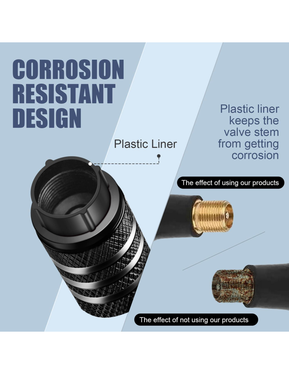 - DISEÑO ANTI-PEGADO: Las tapas de válvula de neumático vienen con una carcasa de metal y un inserto de plástico, que evitará que el vástago de la válvula se corroe, especialmente en áreas húmedas/frías.
