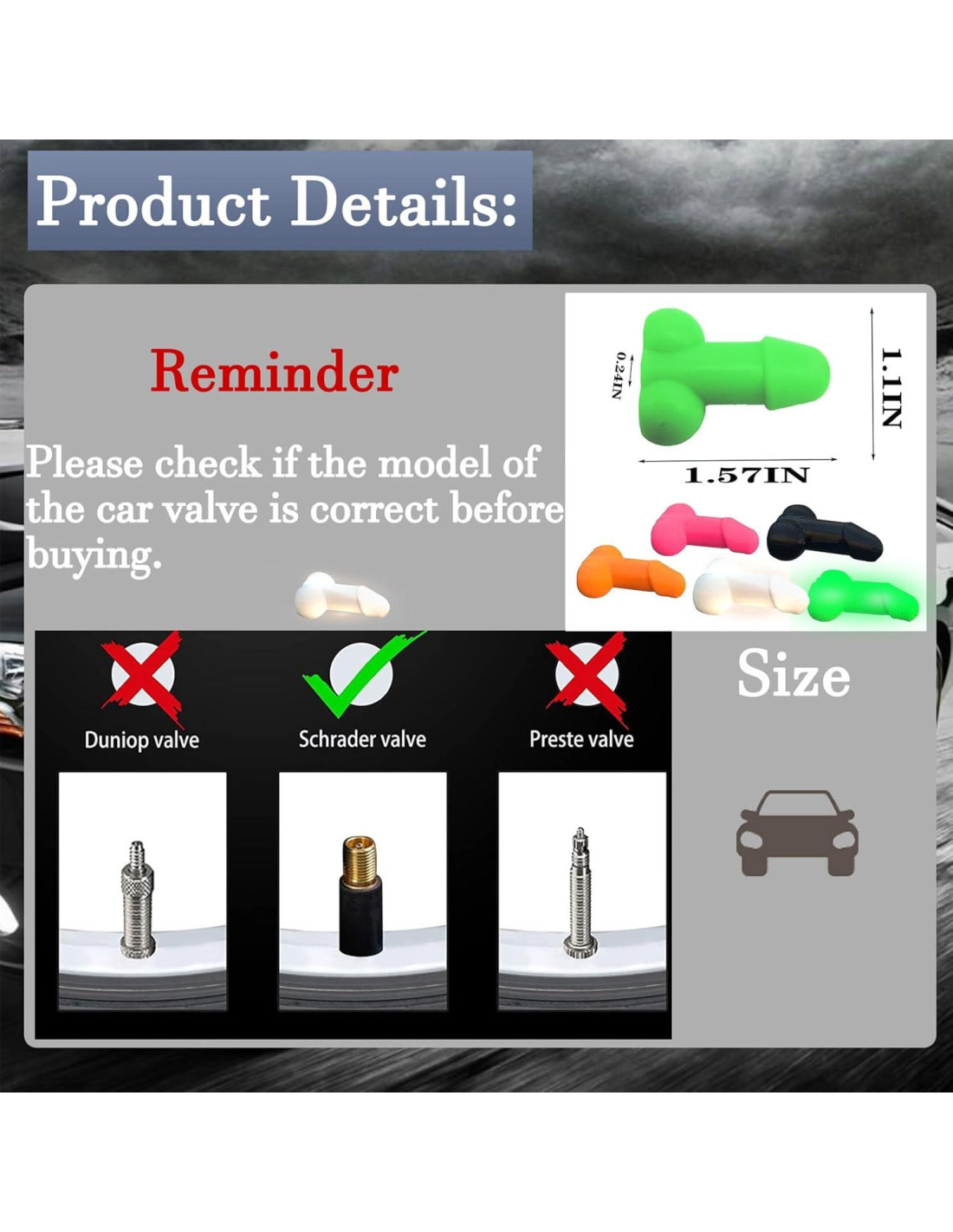 - Amplia Aplicabilidad: Las tapas de neumático divertidas se pueden atornillar en muchos estilos de tapas de neumático. Son universales y adecuadas para muchos autos, bicicletas y motocicletas.