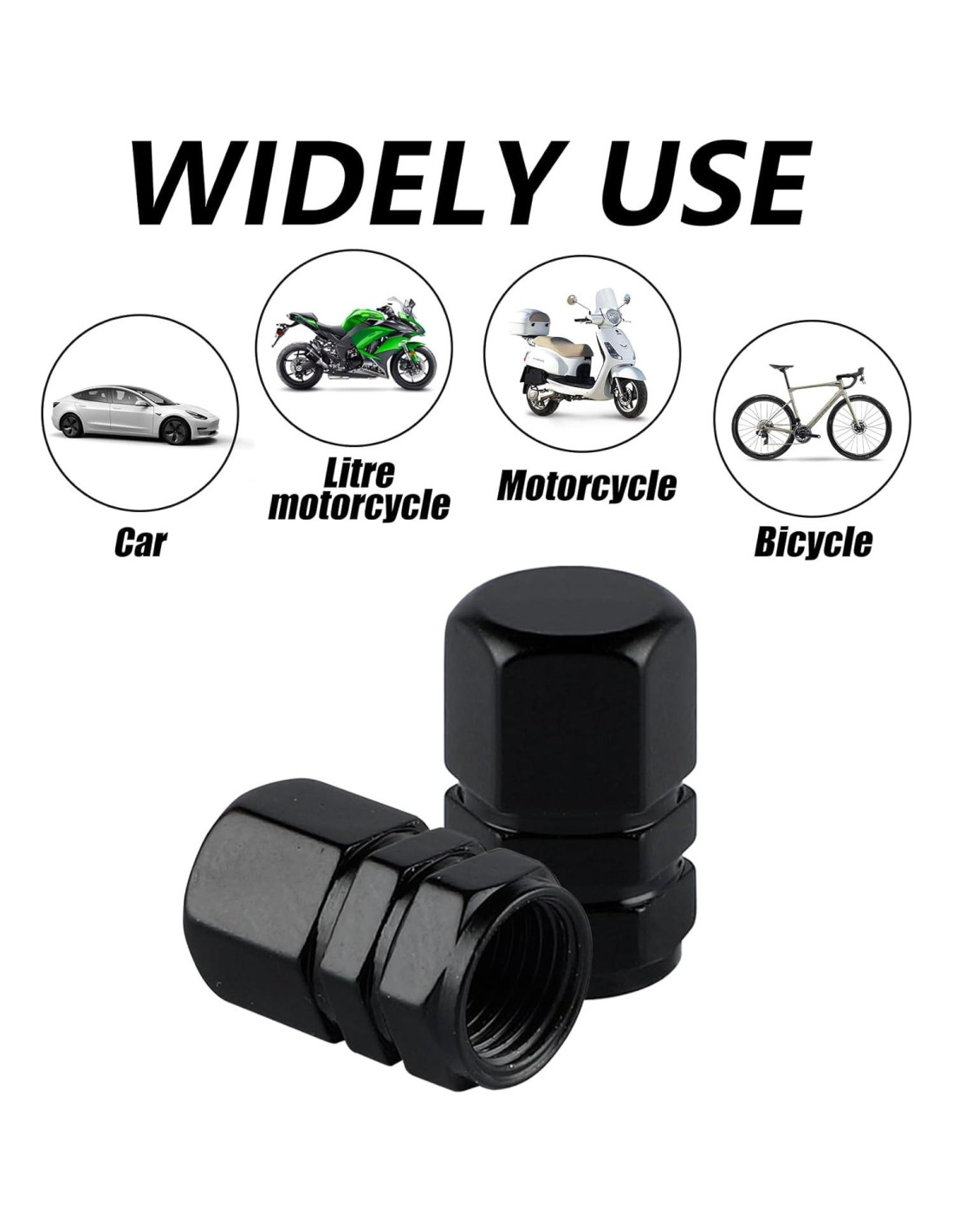 - [Uso amplio] : Un conjunto de 4 piezas. Generalmente adecuado para la mayoría de coches, camiones, SUV, motocicletas y bicicletas. Tenga en cuenta que es mejor quitar estas cubiertas de válvula al entrar en un lavadero automático.