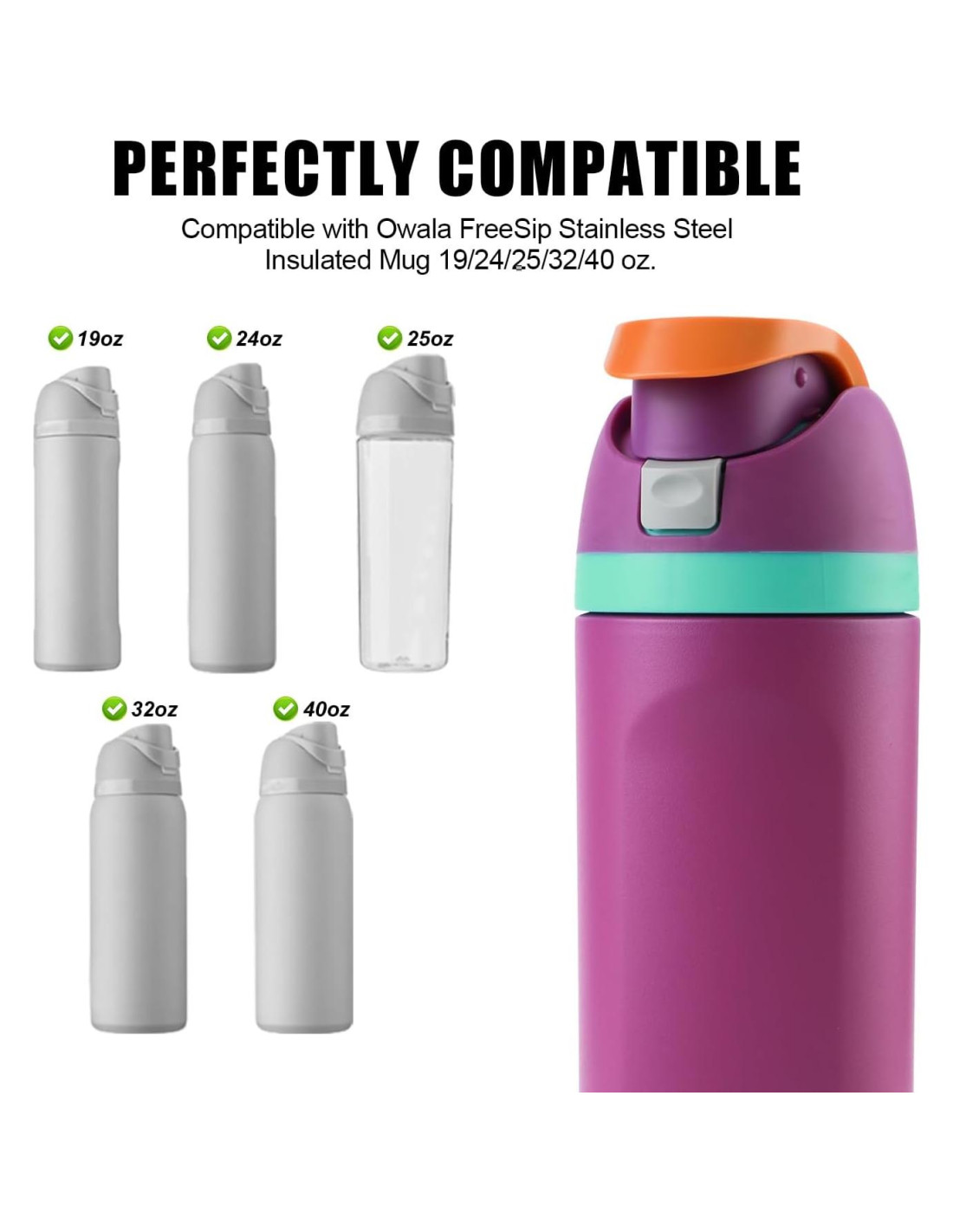 - Consejos Útiles: Nuestros productos son solo adecuados para botellas de agua de acero inoxidable Owala FreeSip y botellas de agua claras de 25oz (0.74L), y no son adecuados para otras marcas. Por favor, confirma los modelos de botella aplicables antes de comprar.